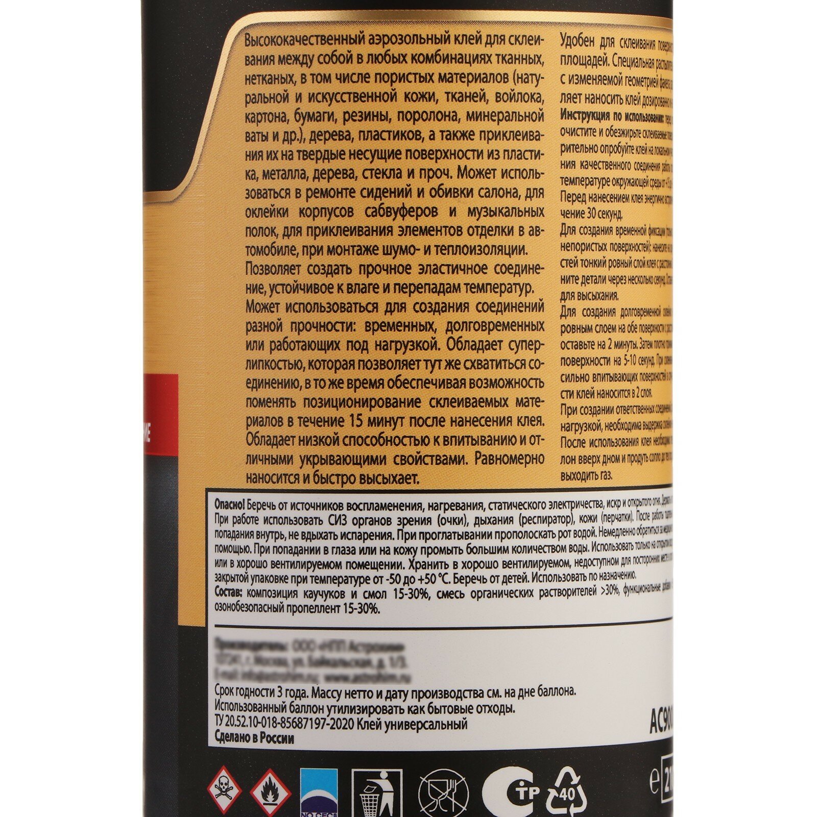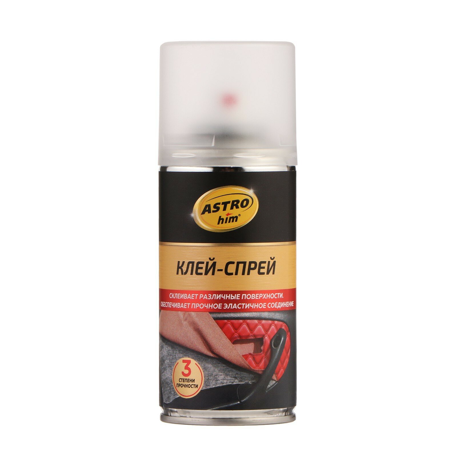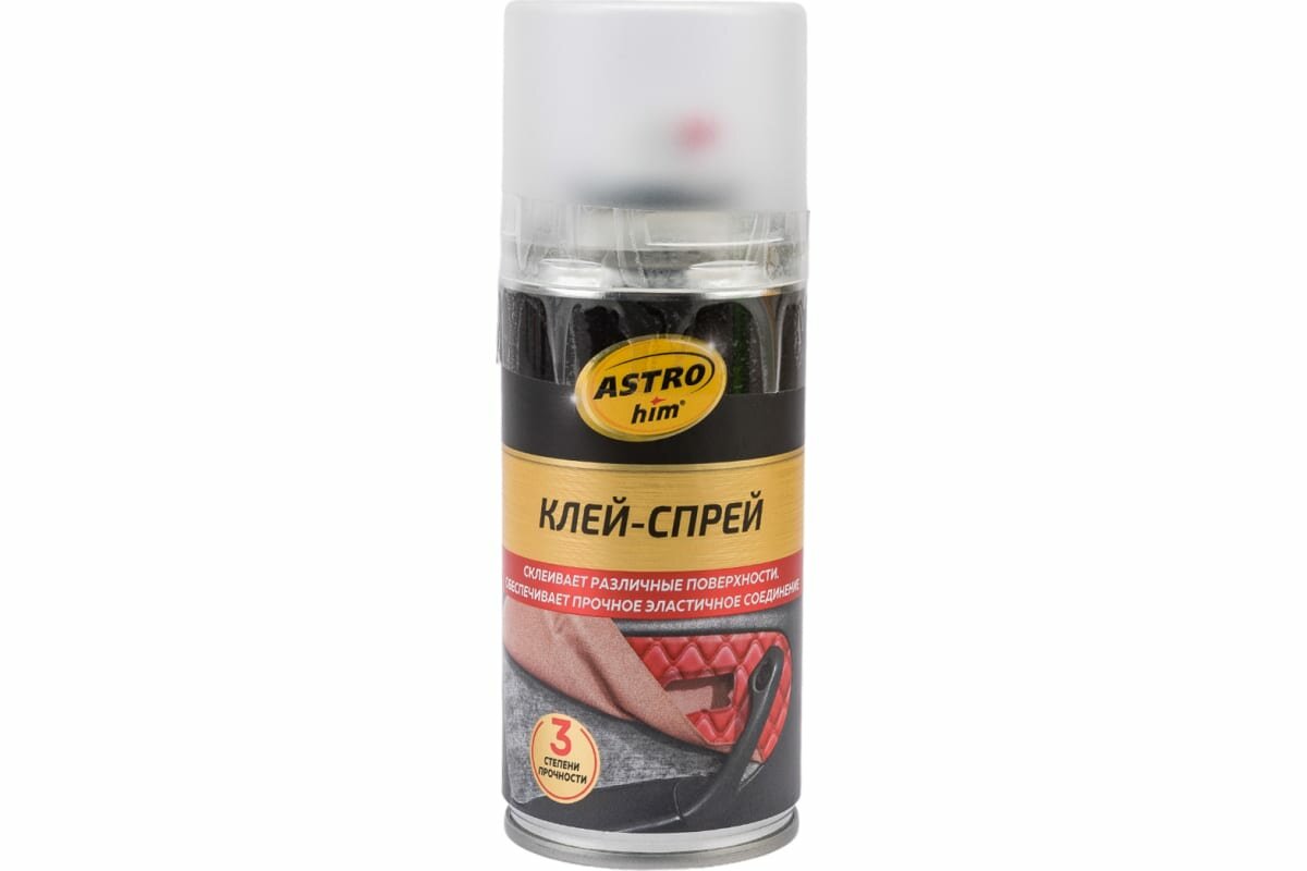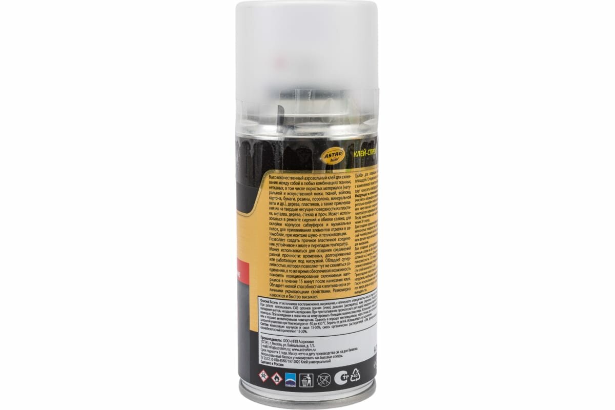 **Клей-спрей Astrohim** — универсальный аэрозольный состав, который позволяет склеить между собой поверхности из различных материалов: тканных и нетканых. Это натуральная и искусственная кожа, резина, бумага, картон, поролон, дерево, пластик, пластик и прочие. Подходит для ремонта сидений и обивки автомобильного салона, склейки корпусов различных приборов, фиксации элементов отделки в интерьере, при монтаже шумо- и теплоизоляционных покрытий и многих других задач. Формирует прочное и износостойкое покрытие, которое имеет высокую устойчивость к влагу и температурным перепадам. Подходит для создания соединений: временных, долговременных, работающих под нагрузкой. Состав схватывается очень быстро. Поменять позиционирование склеиваемых деталей можно в течение 15 минут после того, как клей был нанесен. Перед применением склеиваемые поверхности нужно очистить и обезжирить. Рекомендуется предварительно опробовать средство на локальном участке. Перед использованием нужно энергично встряхнуть баллон с содержимым в течение полуминуты. Хранить вдали от источников воспламенения, нагревания и статического электричества, а также открытого огня и искр.