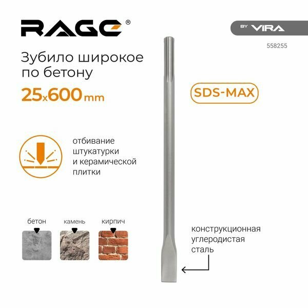 **Зубило SDS-max Rage** предназначено для перфоратора. Оно позволяет скалывать плитку, сбивать штукатурку, выравнивать поверхности. Изделие позволяет выбивать материал в бетоне, кирпичной кладке, камне. Плоское широкое зубило производится из углеродистой стали. Изделие оснащено хвостовиком SDS-max, который имеет 5 пазов.