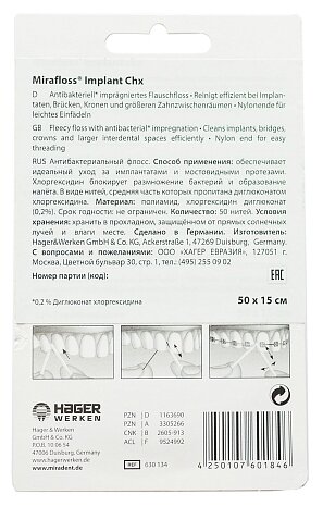 | Состав набора | Miradent Implant CHX Medium зубная нить для имплантов и брекетов 2,2 мл (50 шт по 15 см) Германия |