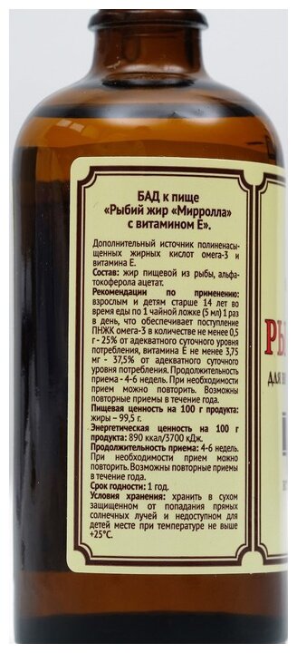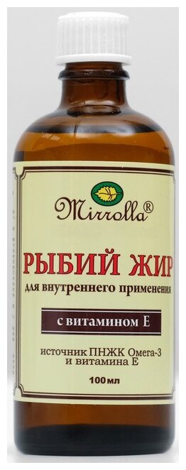 Рыбий жир «Мирролла», производимый из жира норвежского лосося, является источником омега-3 кислот (в том числе эйкозапентаеновой и докозагексаеновой кислоты) и отвечает европейскому стандарту качества и безопасности.Результат после курса приёма:Сильный иммунитет. Регулярное употребление рыбьего жира (особенно в сочетании с витаминами и микроэлементами) защитит от сезонных эпидемий ОРВИ и кишечных инфекций куда надёжнее вакцин и популярных йогуртов.Здоровые нервы. ПНЖК омега-3 — главный строительный материал миелиновых оболочек нервной ткани.Чистые сосуды. Рыбий жир помогает практически полностью защититься от атеросклероза. Свободные от бляшек сосуды, чёткая нервная регуляция сердечной деятельности и сосудистого тонуса в совокупности дают надёжную защиту от ишемической болезни сердца и гипертонии.Крепкие суставы. ПНЖК препятствуют разрушению суставной ткани и обладают противовоспалительным эффектом. Рыбий жир обязательно должен стать частью рациона для каждого жителя современного мегаполиса, ведь остеохондроз, артриты и артрозы стали настоящим бедствием современности.Энергия жизни. Рыбий жир каждый день — это настоящий заряд бодрости. Ведь полиненасыщенные жирные кислоты легко превратить в энергию, необходимую нашим мышцам, мозгу, внутренним органам.Способ применения: взрослым и детям старше 14 лет по 1 чайной ложке (3-3,5 г) 1 раз в день во время еды.Продолжительность приема: 4-6 недель. При необходимости прием можно повторить. Возможны повторные приемы в течение года.Состав: жир пищевой из рыбы, альфа-токоферола ацетат.