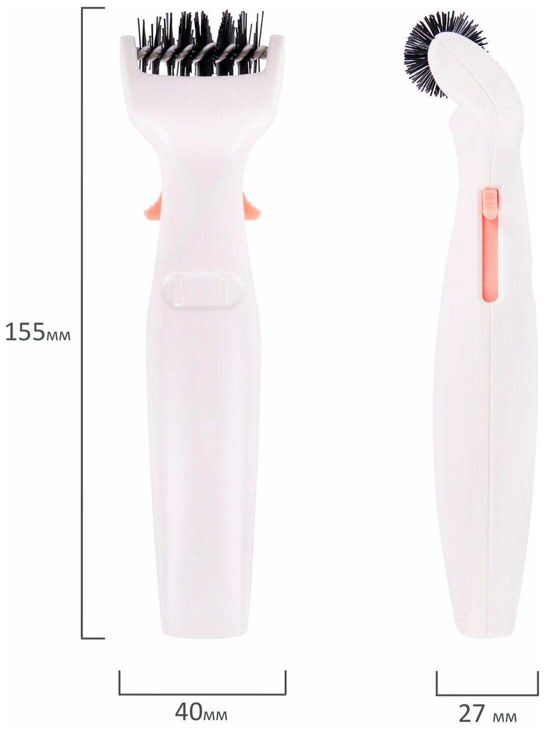 Инструмент представляет собой щетку, позволяющую убрать остатки бумаги, прилипшие к ножу для вырубки и тиснения, удалить мелкие остатки бумаги из вырубленных элементов. Кнопки на изделии позволяют также воспользоваться лопаткой или шилом (по очереди). Лопатка помогает отделить лист бумаги/картона от ножа для вырубки и тиснения. Шило предназначено для создания перфорации и удаления мелких остатков бумаги из вырубленных элементов.