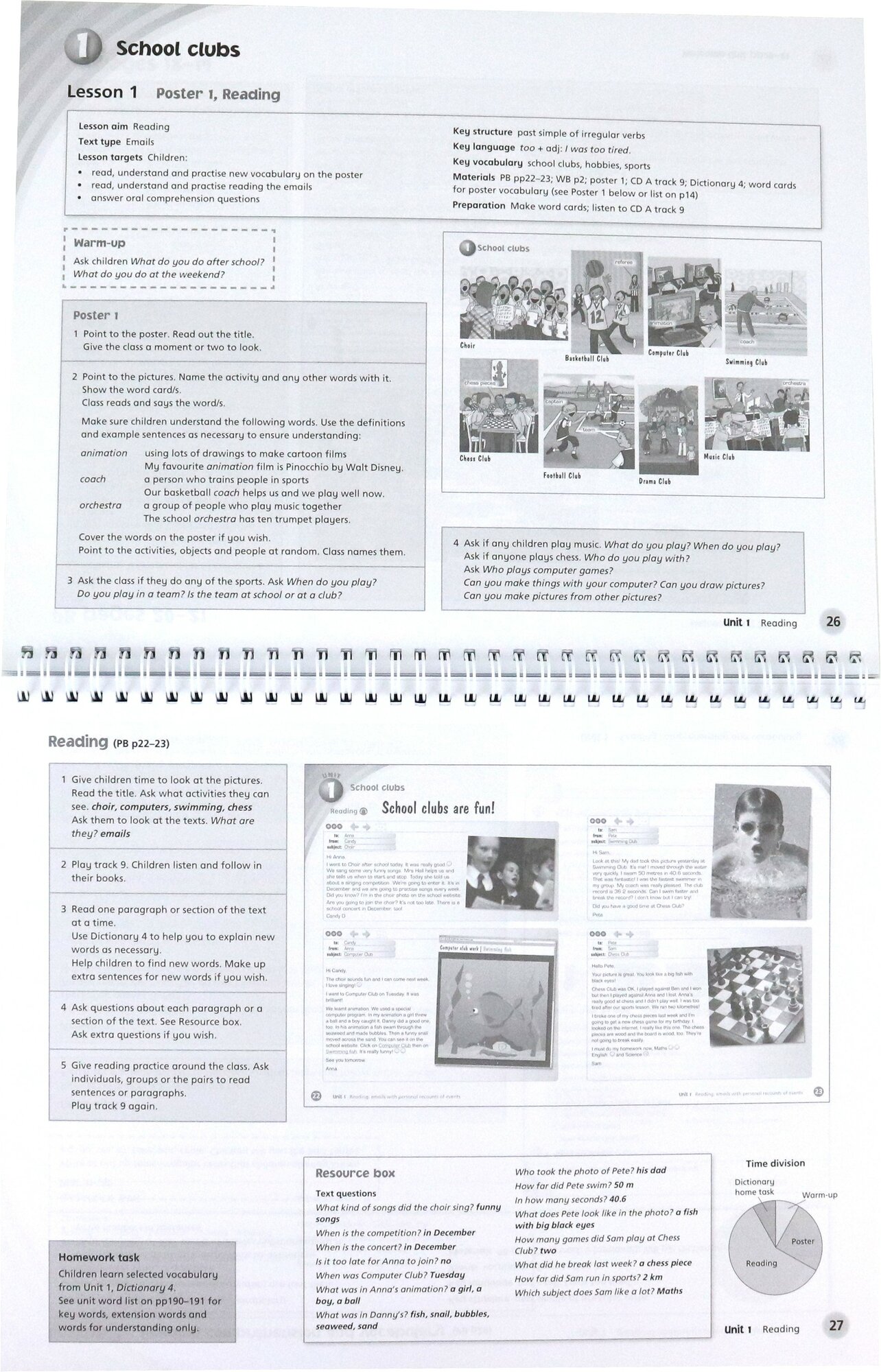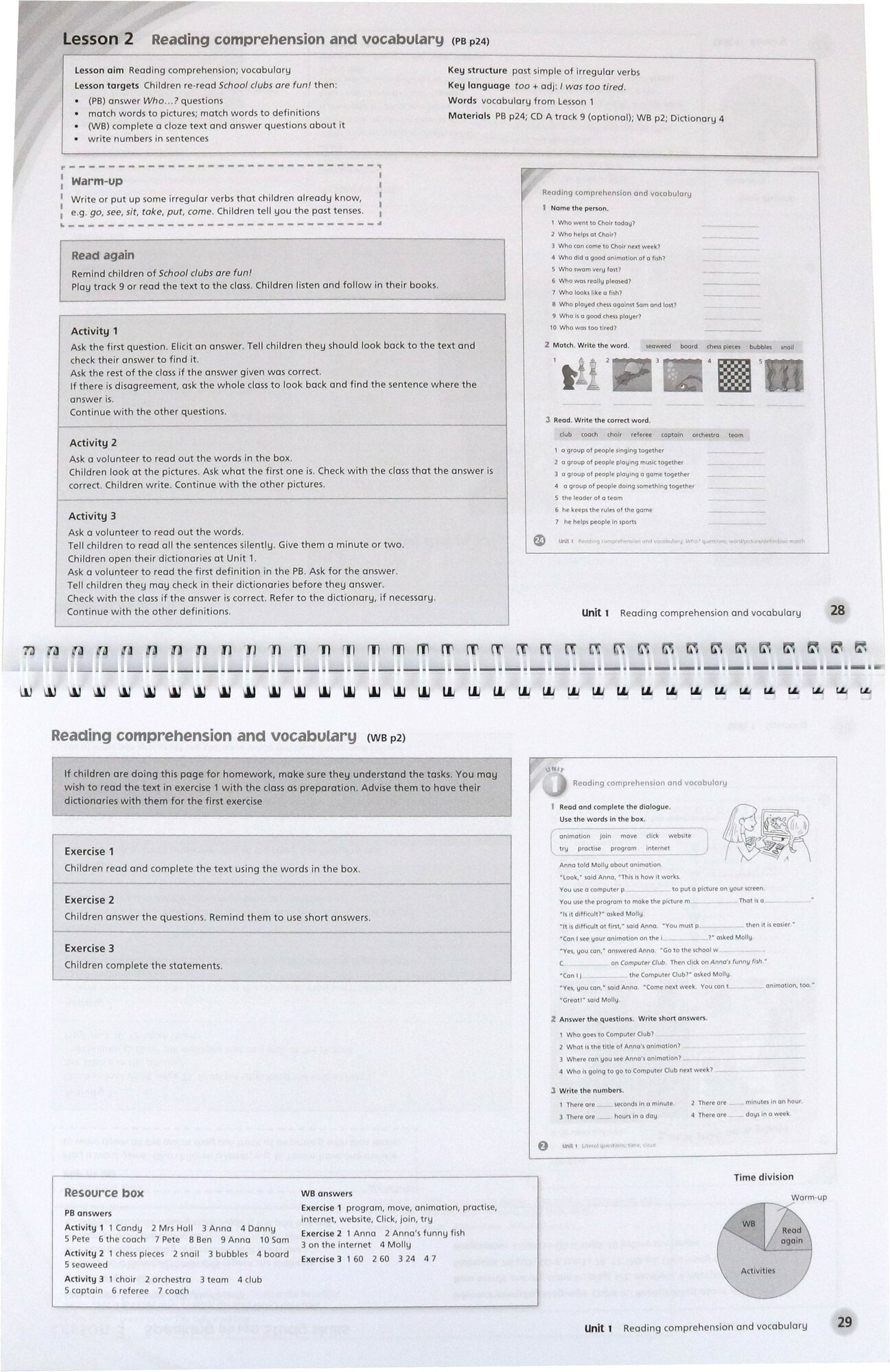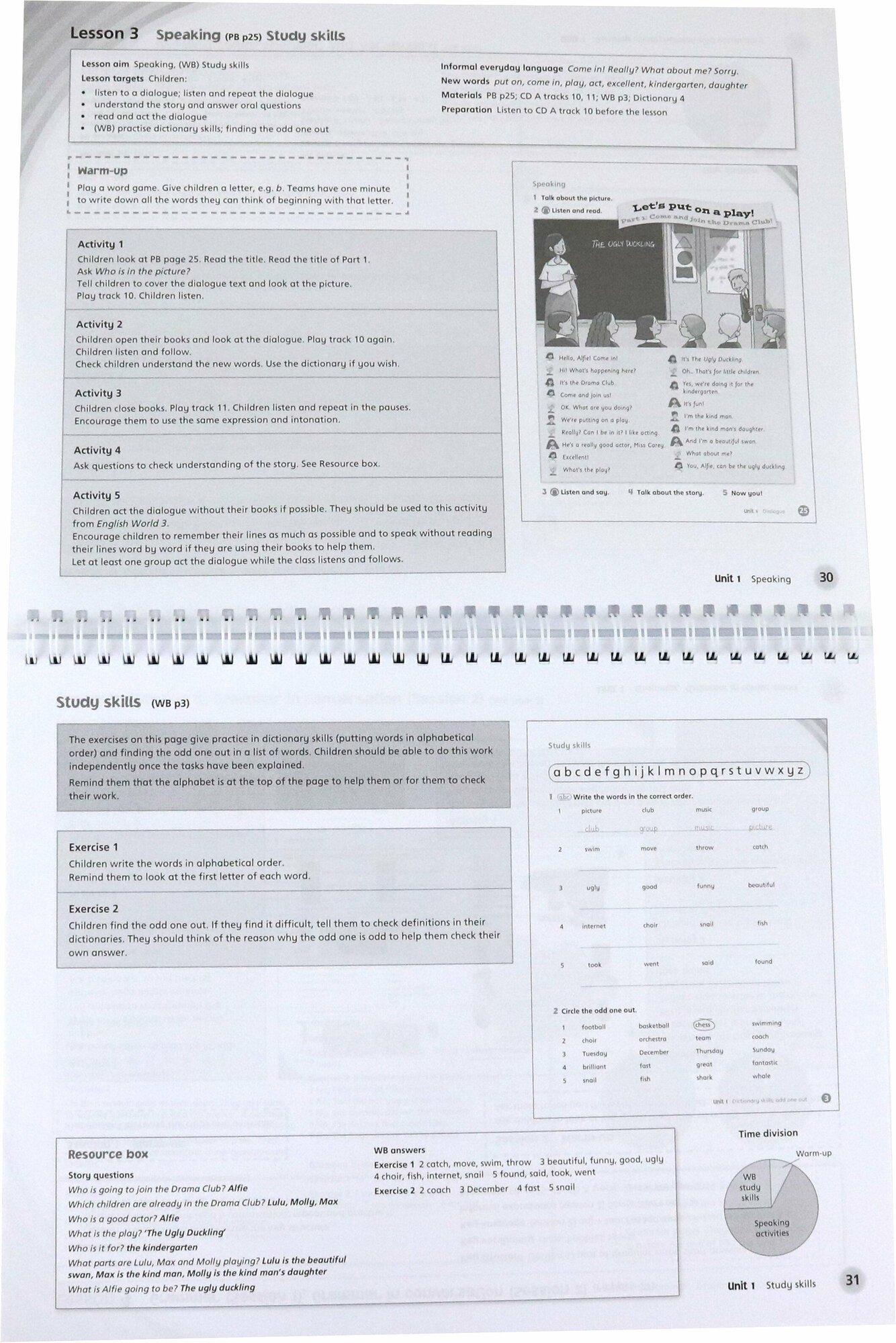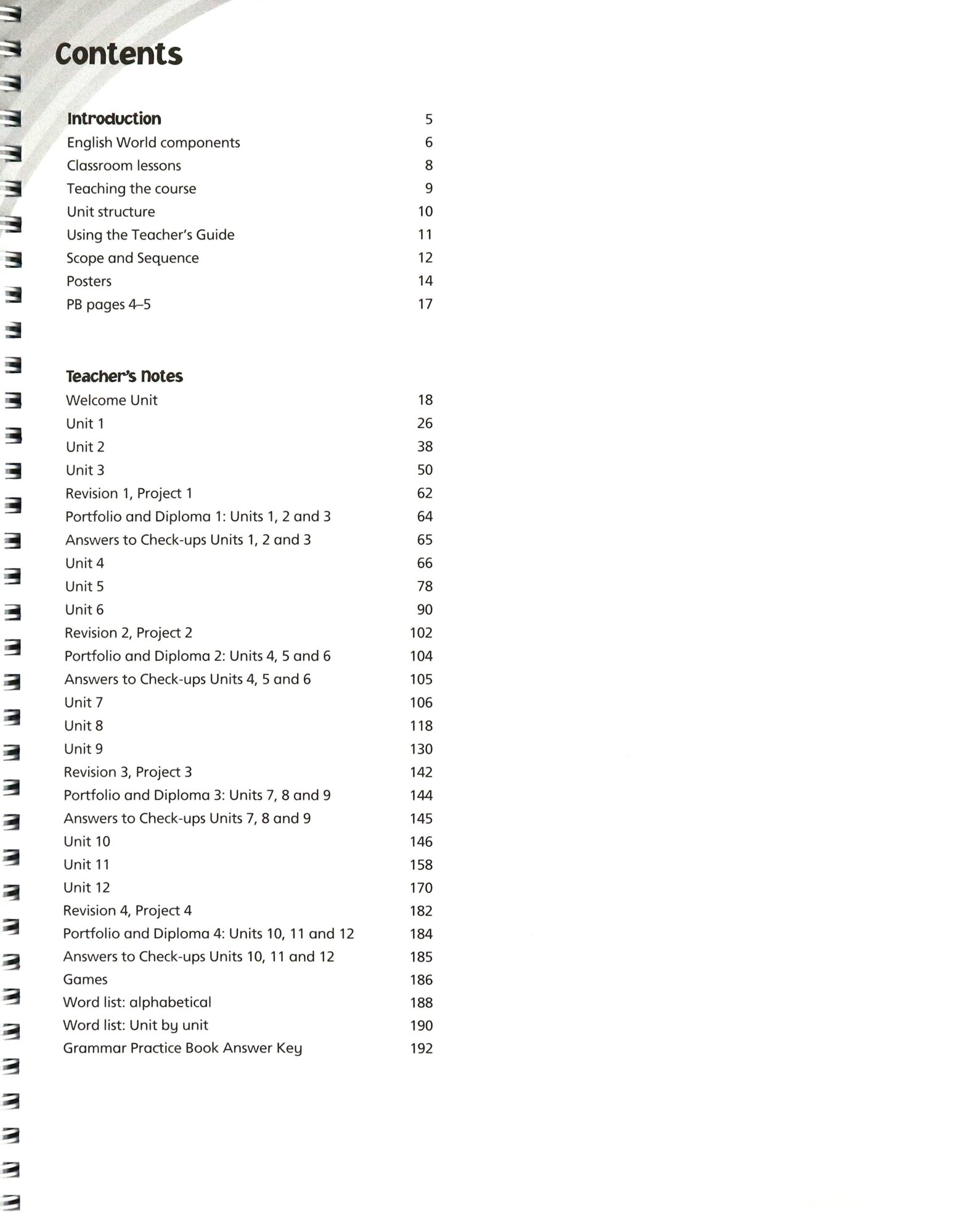 Руководство для учителей English World содержит пошаговые инструкции к каждому уроку. Они расположены вокруг факсимильных страниц учебника и рабочей тетради, чтобы учителя могли видеть, как предполагается использовать материал. Также включены разминки для каждого урока, ключи к ответам по компонентам курса и полезные рекомендации для проведения занятий в классе.