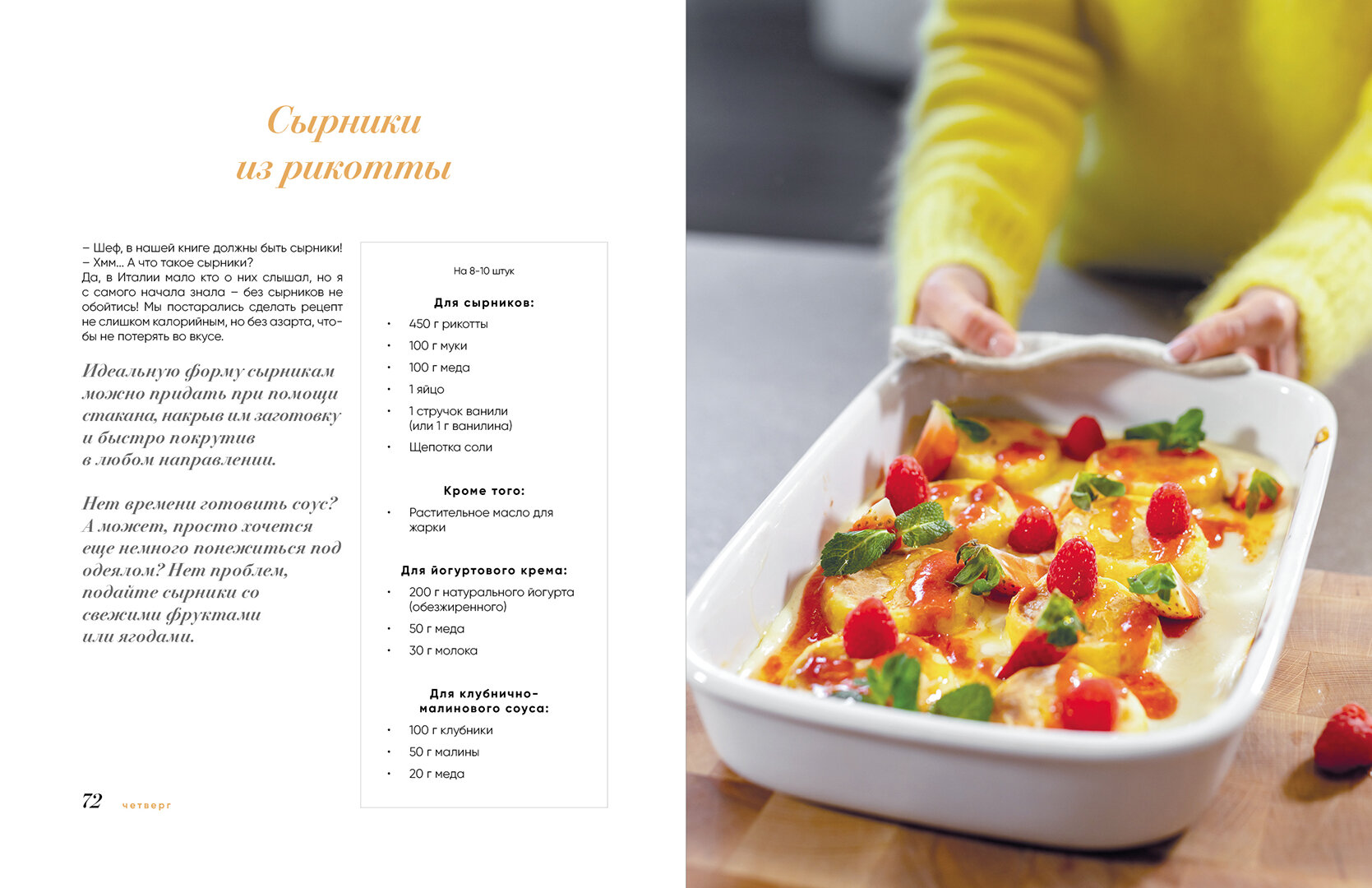 Я испытала эстетическое удовольствие листая эту книгу! Могу сказать с полной уверенностью, что это самое красивое издание в моей коллекции! Оформление на высоте!!! Такие красивые фотографии, что слюни текут ручьям от один лишь изображений! Но в каком восторге я находилась от рецептов!!! О боже. Съела сырники с рикоттой с наслаждением. Все рецепты очень просто написано, что дополнительных вопросов не возникает. Не книга а клад!!!