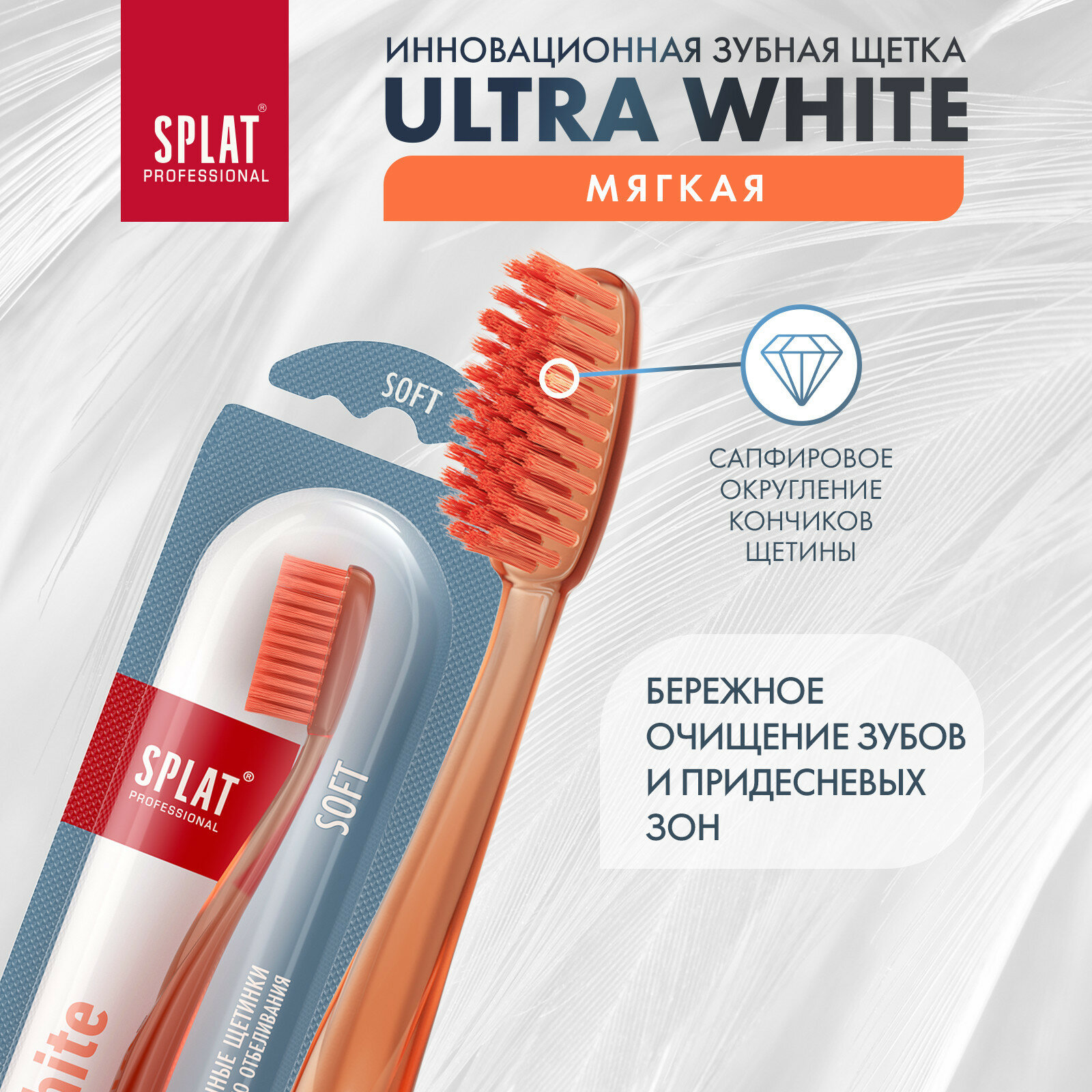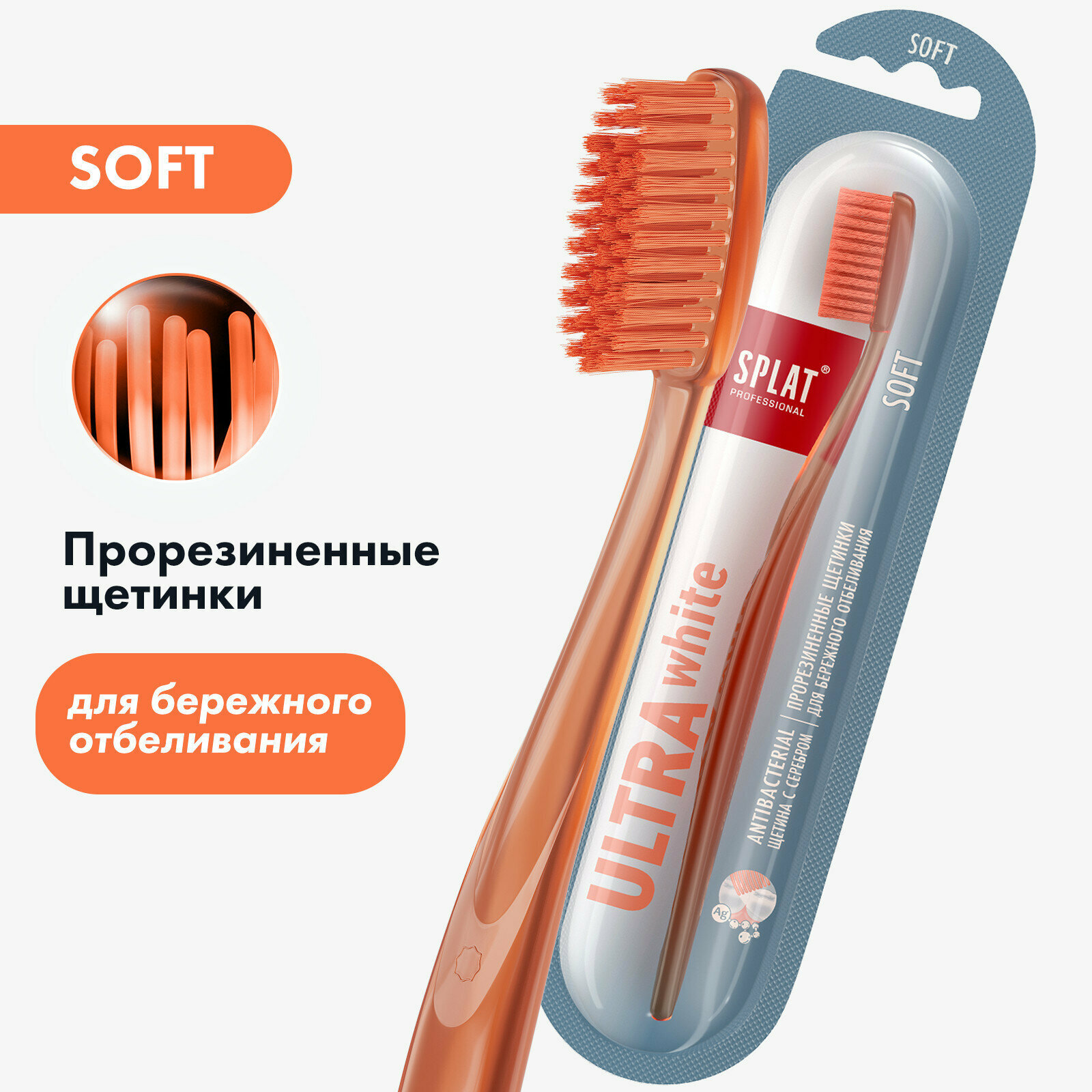 Инновационная зубная щетка SPLAT Professional ULTRA WHITE. Soft / сплат Профешнл ультра уайт. Мягкая. (Оранжевая)Зубная щетка SPLAT Professional ULTRA WHITE с мягкой прорезиненной щетиной бережно ухаживает за чувствительными зубами. 3000 ультратонких щетинок с уникальным резиновым покрытием очищают от налета до белизны (на 40% эффективнее щетки с обычной щетиной). Закругленные кончики щетины не травмируют эмаль и гарантируют безопасность чистки. Антибактериальный эффект щетке придают ионы серебра, которые предотвращают размножение бактерий на щетине.