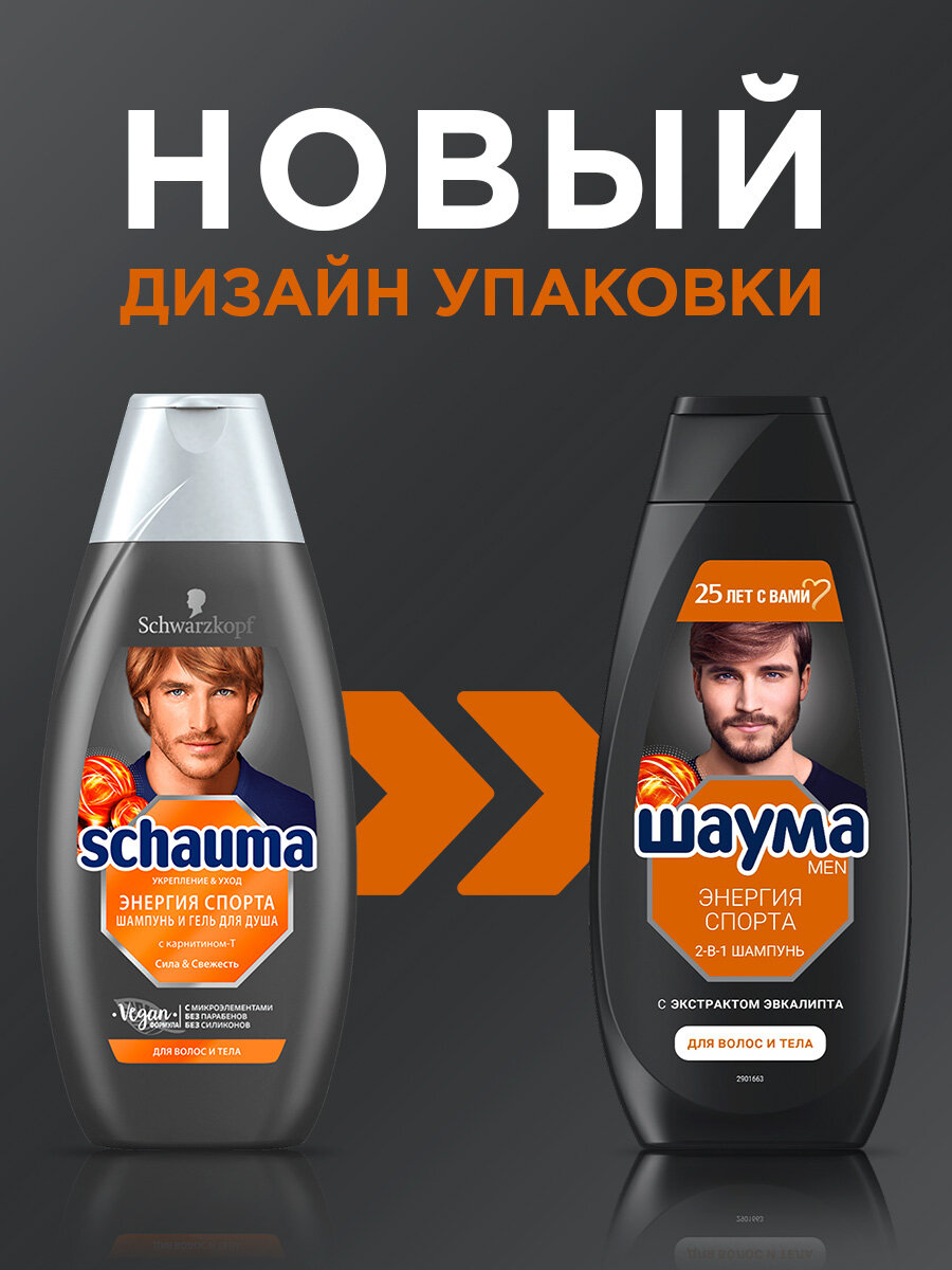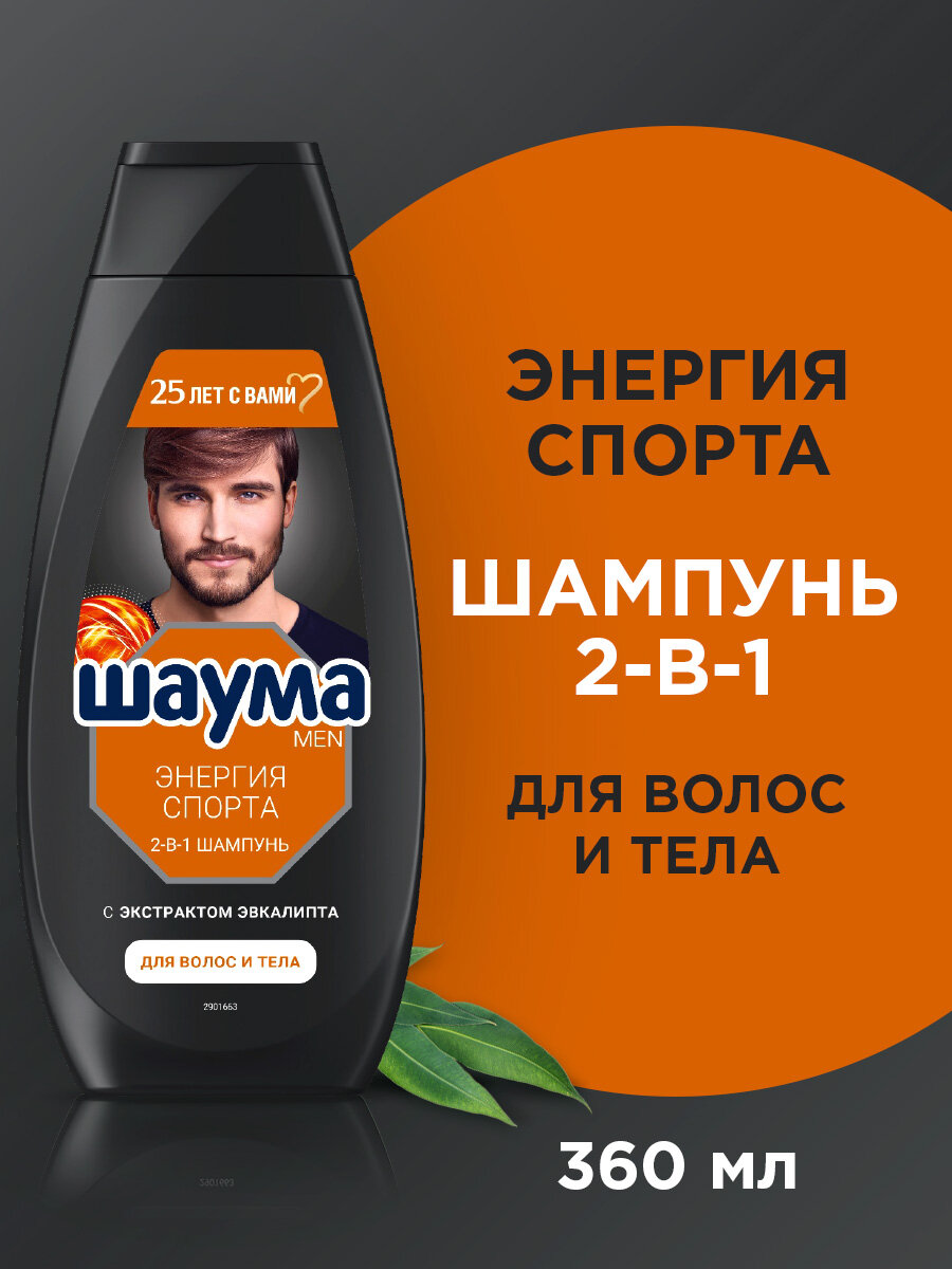 Schauma Шампунь Men Энергия Спорта 2-в-1 с экстрактом эвкалипта, 360 мл. Мужской шампунь «Энергия спорта» подходит для ежедневного применения. Укрепляет волосы. Придает заряд бодрости на весь день. Подходит для волос и тела. Формула с экстрактом эвкалипта, без силиконов и парабенов. Веган – не содержит ингредиентов животного происхождения. Способ применения: Нанести на влажные волосы, вспенить и смыть водой. Избегать контакта с глазами. При попадании в глаза тщательно промыть водой. Только для наружного применения. Хранить в недоступном для детей месте.