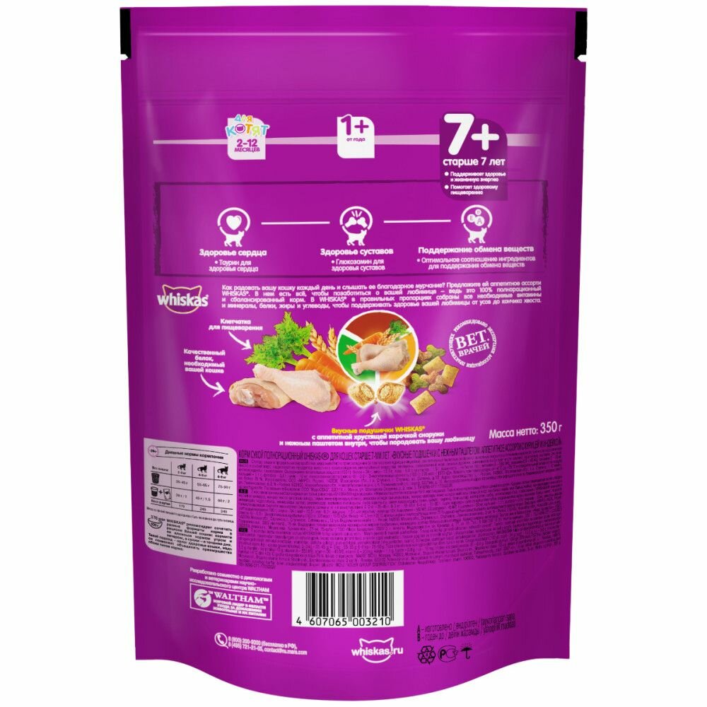 Это вкусное блюдо, приготовленное с учетом потребностей, свойственных возрасту Вашей любимицы. Хрустящие подушечки с нежным паштетом внутри обязательно придутся по вкусу Вашей любимице. Кроме того, Whiskas содержит все необходимое, чтобы еда Вашей кошки была не только вкусной, но и полезной: Витамин Е для поддержания иммунитета Высокоусваиваемые ингредиенты для здорового пищеварения Таурин для здоровья сердца Жирные кислоты Омега-6 и цинк для здоровья кожи и шерсти Источник глюкозамина для здоровья суставов Специальная формула для хорошего аппетита Сбалансированный рацион для поддержания веса