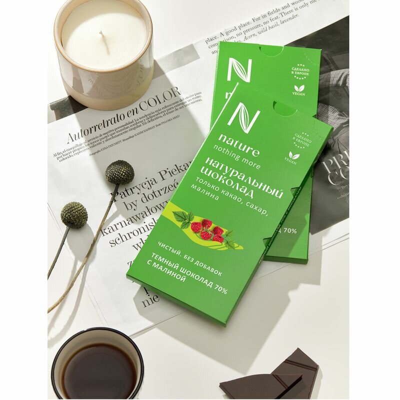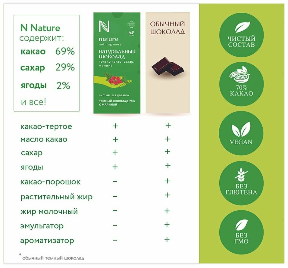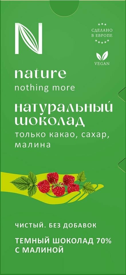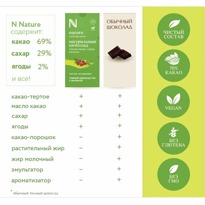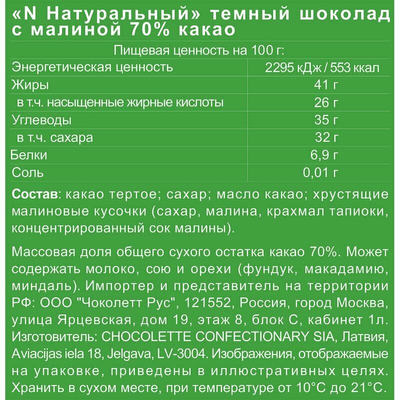 Чистый состав! Только какао, кусочки малины и сахар. N Nature приготовлен из натуральных ингредиентов без искуственных красителей, ароматизаторов и Е-добавок. Ничего лишнего!