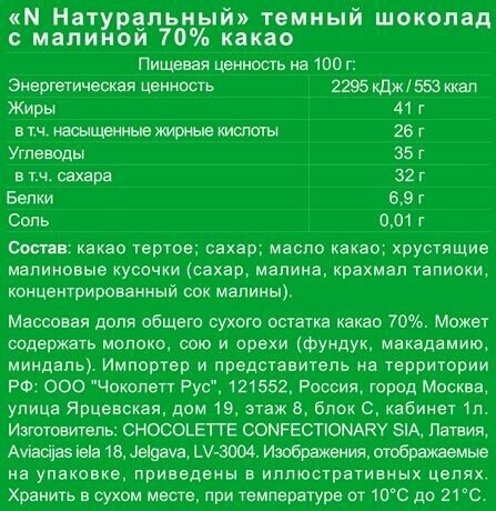 | Состав | какао-тертое, сахар, масло какао, хрустящие малиновые кусочки(сахар, малина, крахмал тапиоки, концетрированный сок малины) Массовая доля общего сухого остатка какао 70%. Может содержать молоко сою и орехи (фундук, макадамию, миндаль) |