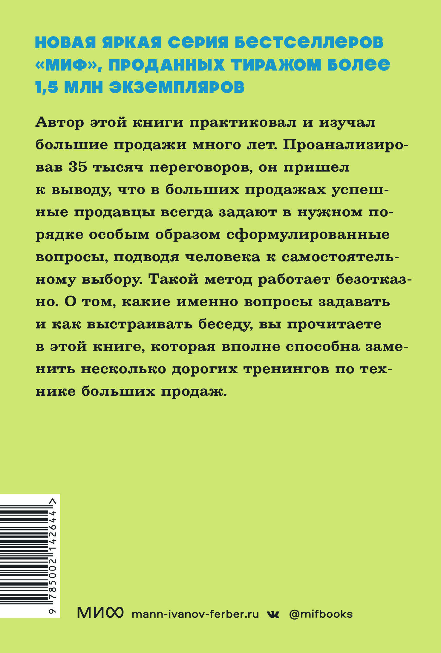 Автор этой книги практиковал и изучал большие продажи много лет. Проанализировав 35 тысяч переговоров, он пришел к выводу, что в больших продажах успешные продавцы всегда задают в нужном порядке особым образом сформулированные вопросы, подводя человека к самостоятельному выбору. Такой метод работает безотказно. О том, какие именно вопросы задавать и как выстраивать беседу, вы прочитаете в этой книге, которая вполне способна заменить несколько дорогих тренингов по технике больших продаж.