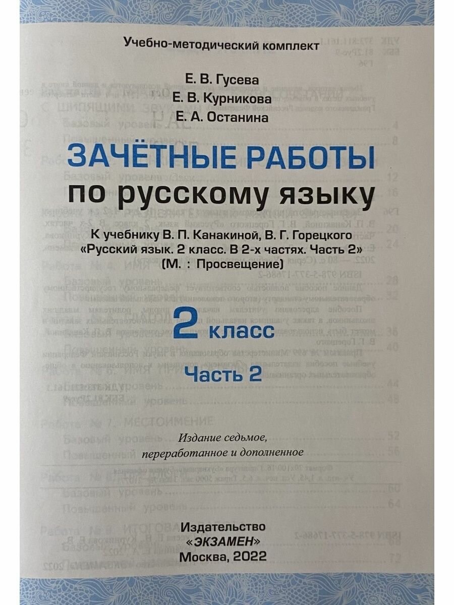 Зачетные работы по русскому языку: 2 класс: В 2-х частях. Часть 2: к учебнику В.П. Канакиной В.Г. Горецкого «Русский язык. 2 класс. В 2-х частях. Час (Гусева Екатерина Валерьевна; Курникова Елена Владимировна; Останина Евгения Андреевна); Экзамен, 2022