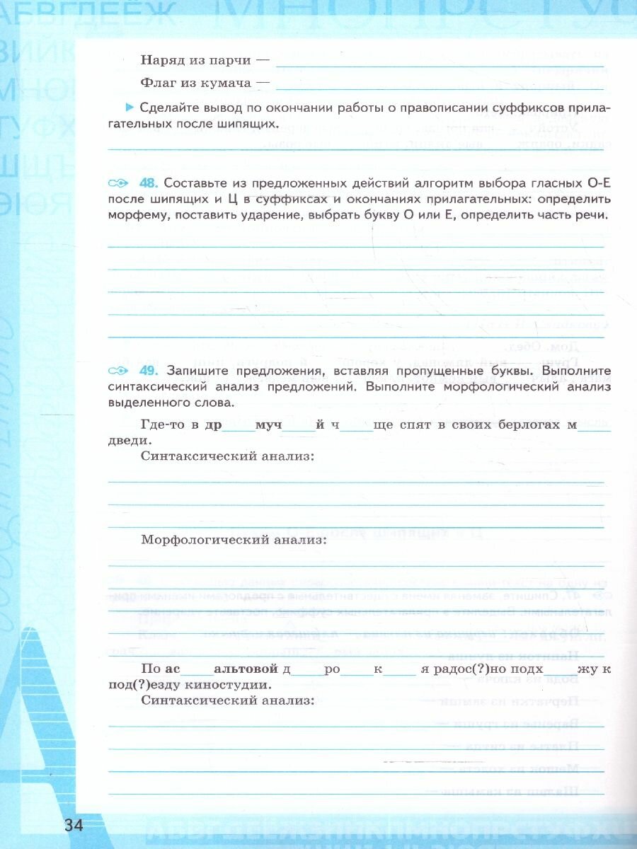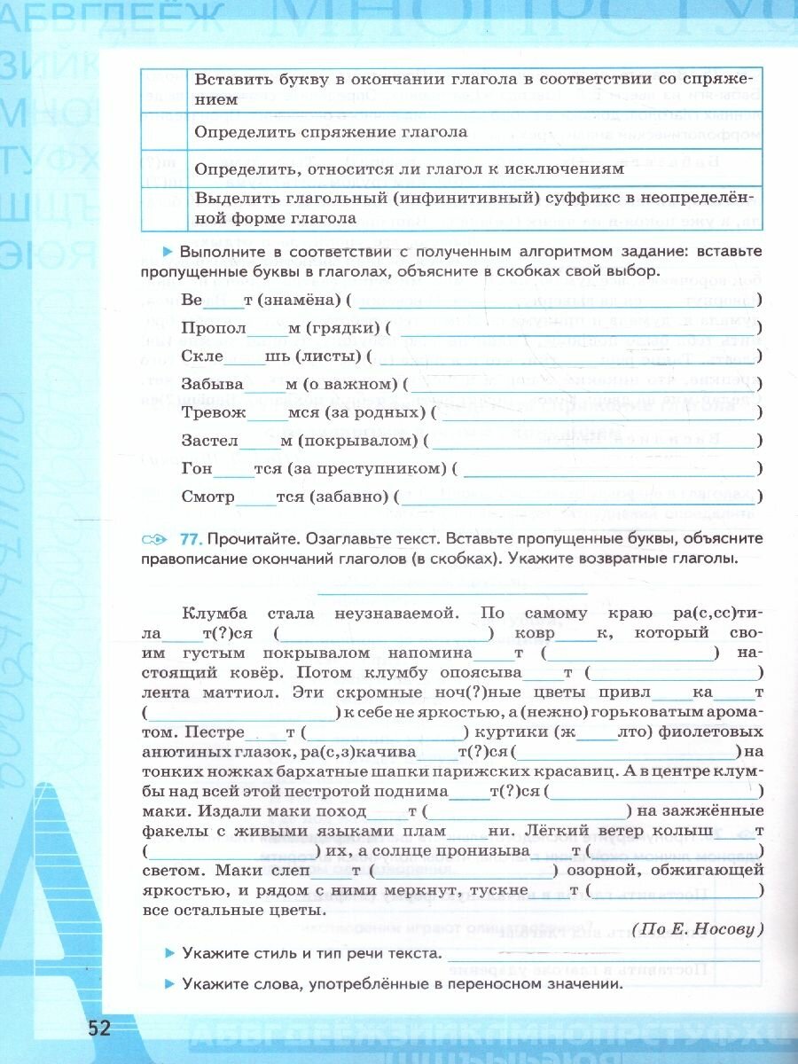 В рабочей тетради содержатся дополнительные задания к каждому разделу учебника, выполняя которые ученик сможет глубже осмыслить теоретический материал, разобраться с помещенными в учебнике правилами, научиться применять эти правила на практике, узнать об особенностях разных видов текстов и потренироваться в их создании, поупражняться в фо-нетическом, морфемном и грамматическом анализах.