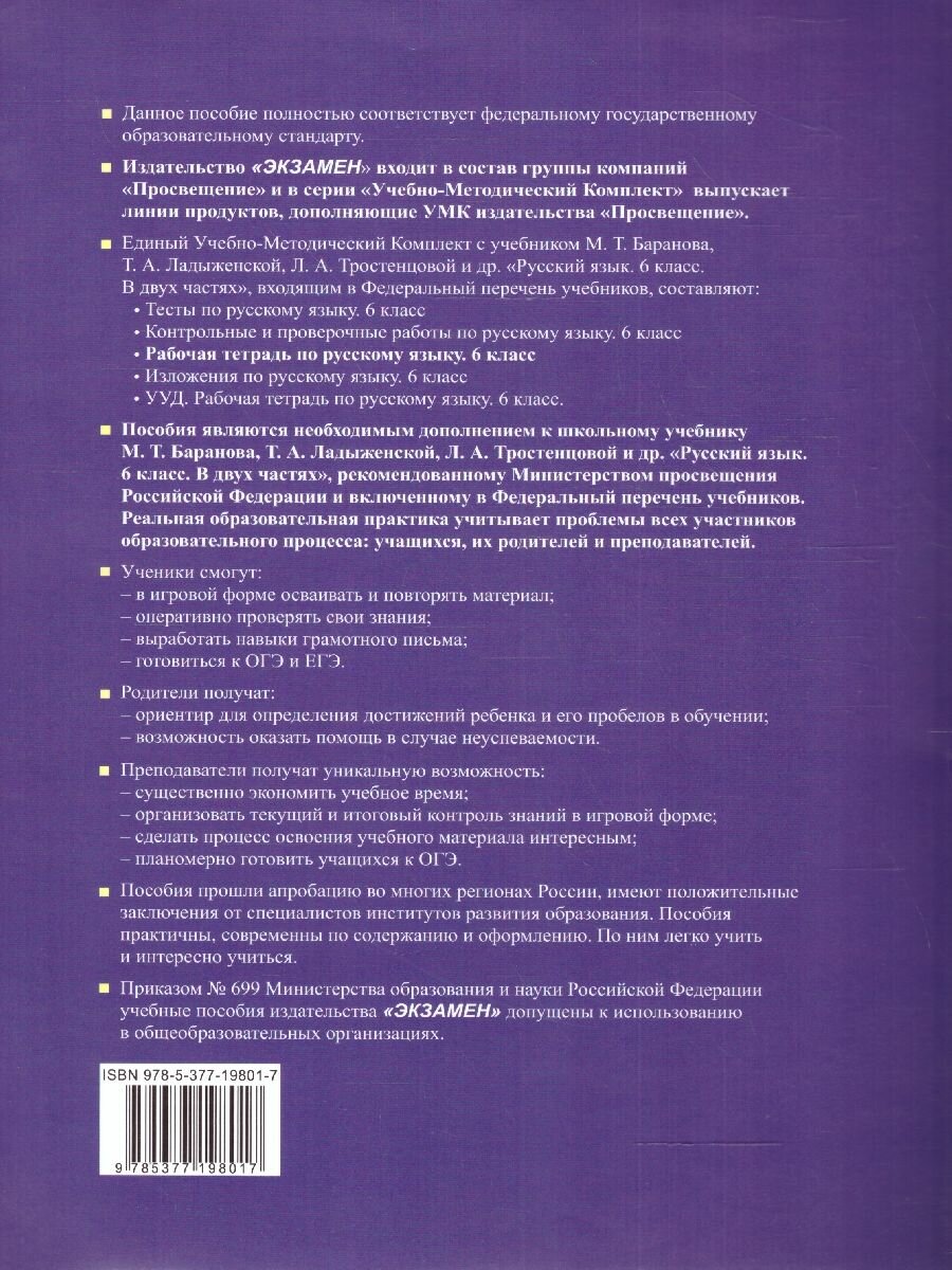 Данное пособие полностью соответствует федеральному государственному образовательному стандарту. В рабочей тетради содержатся задания к каждому разделу учебника, выполняя которые ученики могут глубже осмыслить теоретический материал, разобраться с помещенными в учебнике правилами, научиться применять эти правила на практике, а значит, повысить свою грамотность. В тетрадь включены тексты лучших мастеров слова русской литературы, что позволит шестикласснику видеть и понимать красоту художественного текста, учиться выразительности собственной письменной речи. Издание рассчитано на учителей русского языка, методистов, учащихся.