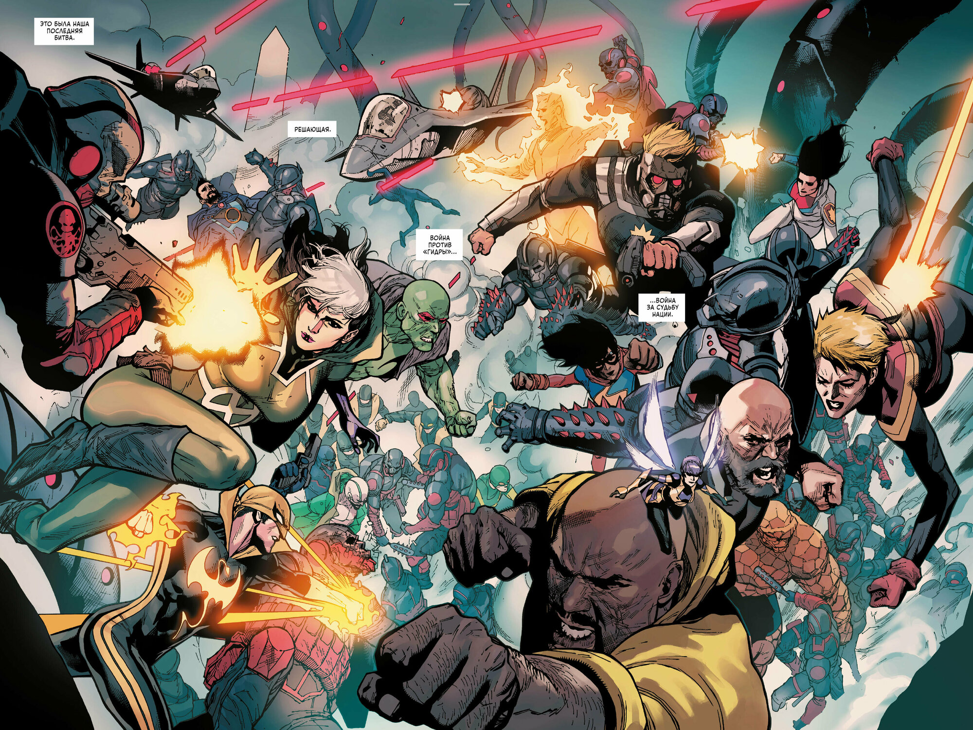То что предлагалось читателю в Секретная империя Пролог, выливается в мощное продолжение в виде данного комикса. Конечно эффект ВАУ был определённо в конце Пролога и здесь такого подобия нет, но сюжет настолько динамичен, непредсказуем и драйвов, а команда героев масштабна как никогда, но при этом легко уязвима, ибо кто-кто а Роджерс знает Все уязвимые Места Всех героев и злодеев, что книга читается на одном дыхании. Вроде привычное событие для Марвел, но оно играет действительно свежими красками, ведь ход конём, который сделал автор в прошлой книге, держит в крайнем интересе и даже напряжении, а художества здесь, так вообще играют большую роль, ведь после рисунка Андрэа Соррентино, художники просто не могут рисовать хуже и выдают поистине библейское полотно. Это эпичное зрелище и мощное издание обязано лежать на ваших полках.