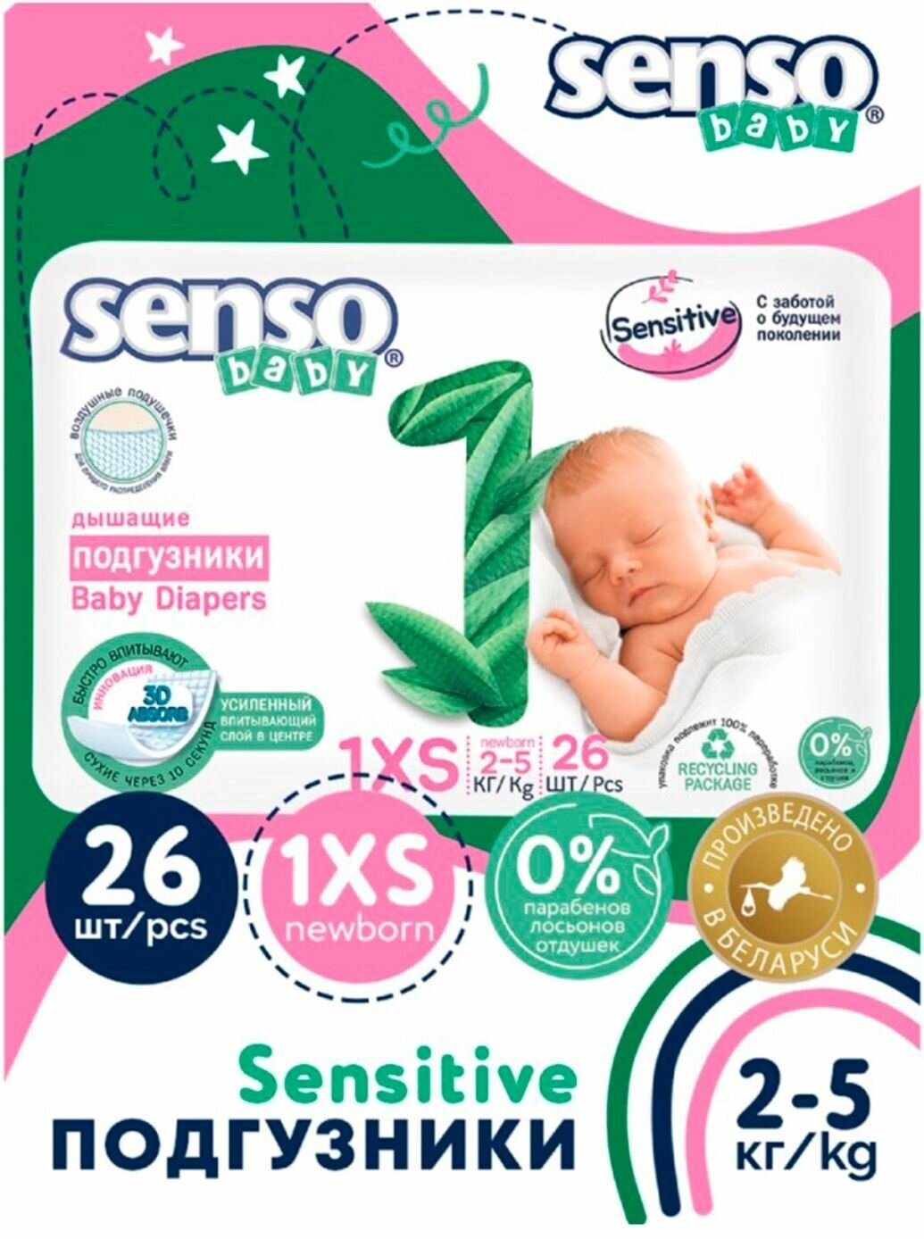 Подгузники для детей Sensitive Senso/Сенсо 2-5кг 26шт р.XS ООО МедЛен (2395438) (размер: 1/NB (2-5 кг))