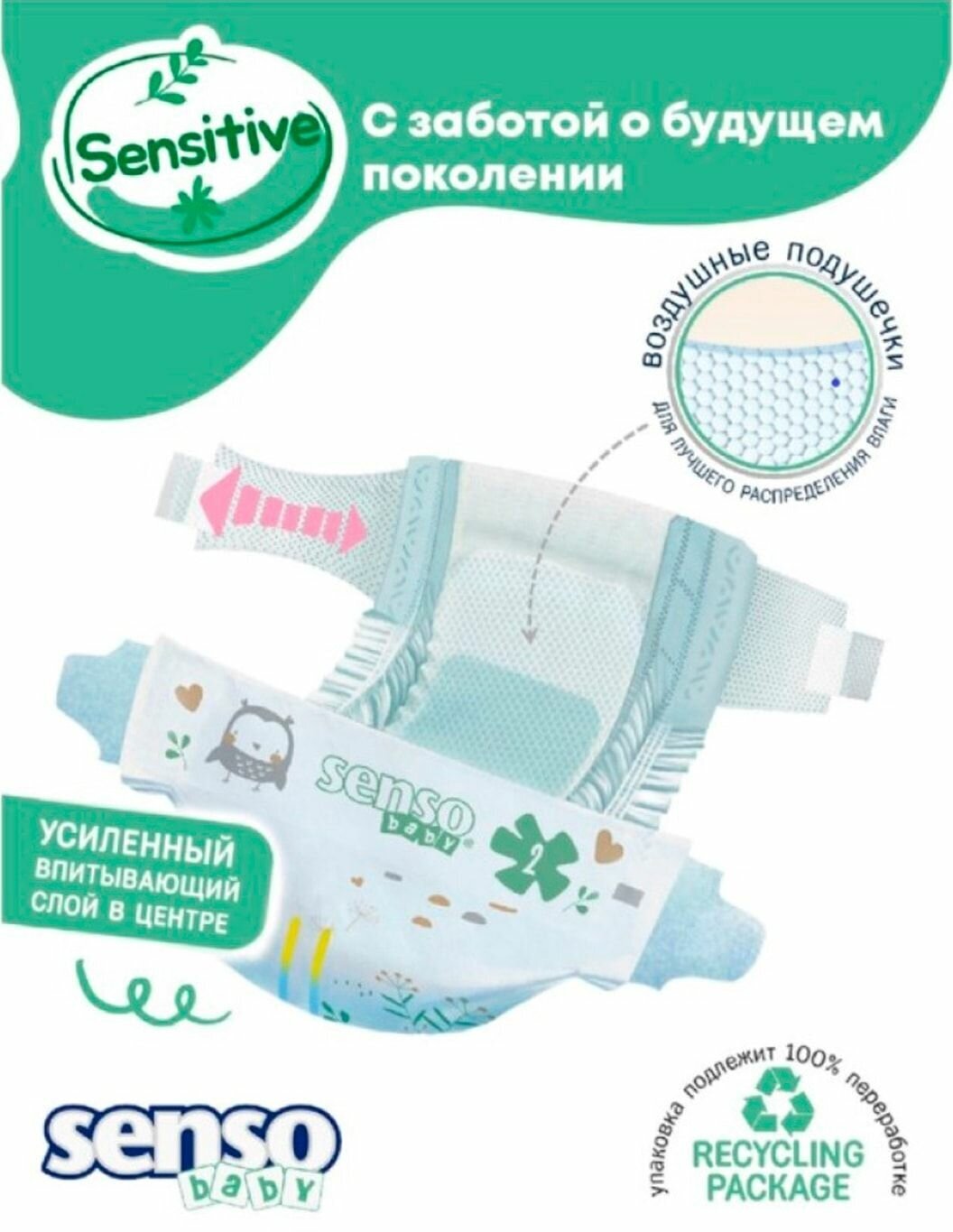 Линейка подгузников «SENSO baby» — это премиальное европейское качество, по разумной цене. Преимущества: • Эластичные боковые ушки Позволяют надежно удерживать подгузник на теле малыша, а также обеспечивают максимальное прилегание его к телу ребенка, даже когда малыш активно двигается. Эластичные ушки в отличие от задней резинки более надежно фиксируют подгузник, не стесняя движения ребенка и не сдавливая его кожу • Многоразовые застежки Не только сохраняют свои свойства при многократном использовании, но и позволяют добиться правильной посадки подгузника на теле, что делает его более комфортным для малыша. • Надежные барьерчики Предохраняют от бокового протекания, легко тянутся и не сдавливают ножки малыша. • ADL-экстра впитывающий слой Равномерно распределяет влагу по всей поверхности впитывающего слоя, не допуская комкования. • Дышащий наружный слой С мельчайшими микропорами, изготовленный из нетканого материала, позволяет воздуху свободно циркулировать и предотвращает появление опрелостей и раздражения. • Индикатор влаги Показывает, когда необходимо сменить подгузник. • Линейка для симметричной фиксации Позволяет правильно зафиксировать подгузник на теле малыша. Влажные салфетки SENSO baby обеспечат дополнительный уход за кожей вашего малыша.