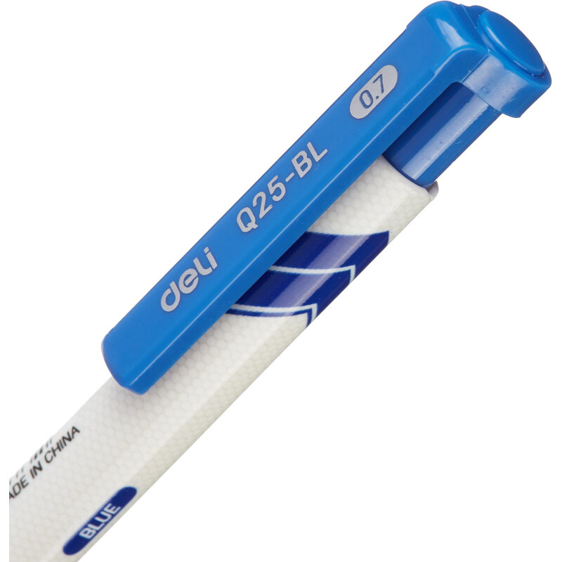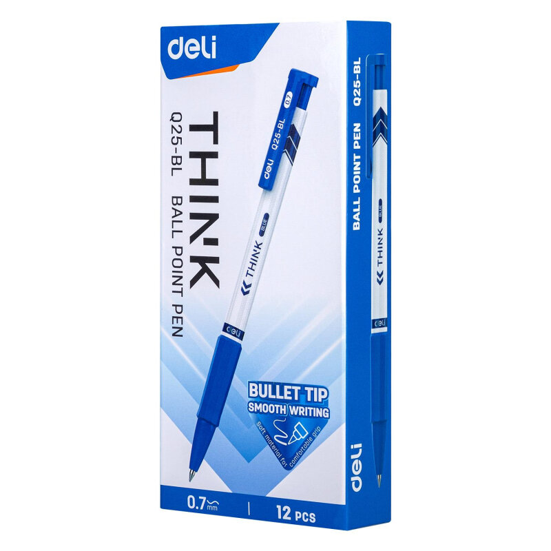Ручка синяя шариковая автоматическая Deli Think с диаметром пишущего узла 0.7 мм. Мягкая каучуковая подушечка предотвратит скольжение пальцев при письме. Цвет грип-зоны и клипа соответствует цвету чернил. Удобный клип позволяет фиксировать ручку на ежедневниках, блокнотах и карманах одежды. В производстве ручек используются чернила пониженной вязкости, обеспечивающие необыкновенно мягкое и четкое письмо на любой бумаге. Высококачественные чернила позволяют увеличить продолжительность письма и сократить их расход. Ручка со стреловидным наконечником пишет очень тонко и аккуратно. Длина непрерывной линии составляет 1000 м при толщине 0.35 мм, что является высоким показателем в своей категории.