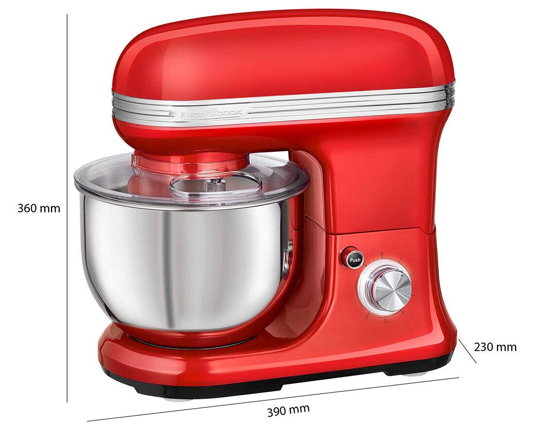 Добротный планетарный миксер от компании Profi Cook, который отлично подойдет для замешивания и взбивания большого количества теста и крема для тортов. Но все же в первую очередь он выделяется своим интересным дизайном, напоминающим ретро-приборы. Вы можете выбрать одну из двух предложенных расцветок — красную или серую под металл, но обе они выглядят здорово и сделают устройство украшением любой кухни. Однако привлекательна модель не только своим дизайном. Она оснащена большой металлической чашей объемом 5 литров, в которой за раз можно замесить до 3 кг теста. Прозрачная съемная крышка защищает от брызг и позволяет прямо во время процесса добавлять ингредиенты через специальное отверстие. Мощности Profi Cook PC-KM 1197 в 1200 Вт хватит для выполнения задач любой сложности, а 6 скоростей и импульсный режим помогут подобрать необходимую интенсивность смешивания и взбивания в зависимости от типа продукта и конечной цели. Переключаются они плавно, не разбрызгивая содержимое чаши, с помощью поворотного регулятора с подсветкой. В комплект входят три металлические насадки: крюк для замеса теста, венчик и лопатка для перемешивания. А за устойчивость прибора во время работы отвечают ножки-присоски на дне корпуса.
