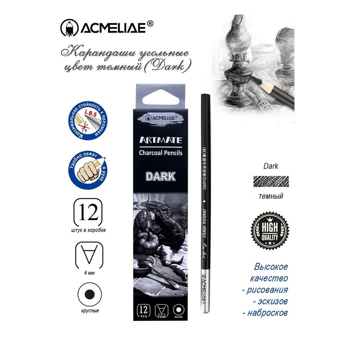 Грифель — утолщенный, ударопрочный, мягко рисует по бумаге. Корпус карандаша выполнен из древесины, легко затачивается и позволяет работать углём не пачкая руки.