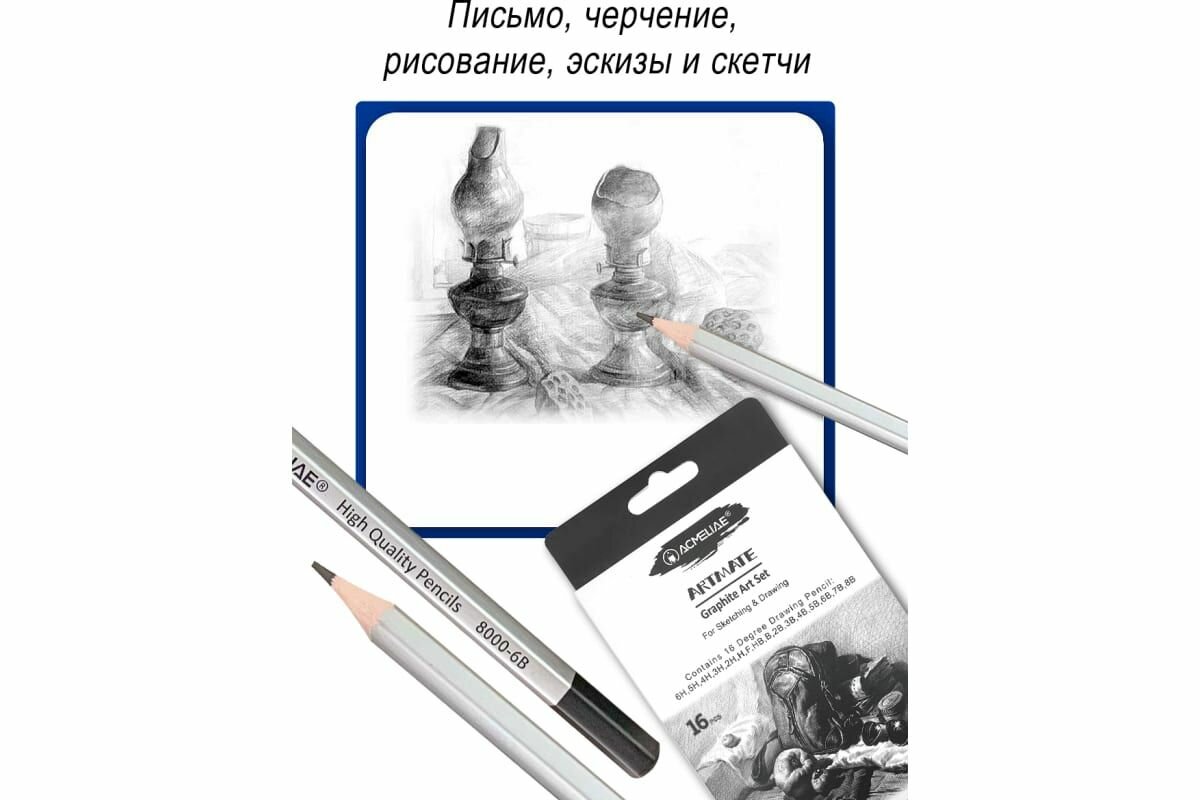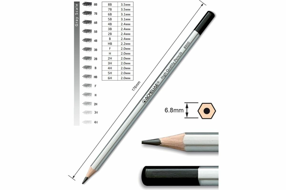 Шестигранный корпус легкий, удобно лежит в руке, пальцы не скользят – можно работать без усталости. Корпус из высококачественной древесины ровно и аккуратно затачивается стандартными точилками, не меняет цвет, упругость, не трескается. Длина корпуса 178 мм. Матовая бархатистая лакированная поверхность, серебристый корпус, запаянный верх. Заточенные. Художественные профессиональные карандаши подойдут для студентов вузов, инженеров, художников, архитекторов, чертежников, дизайнеров, художественных студий, школ, колледжей, школьников.