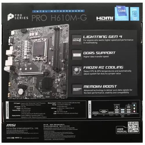 Материнская плата MSI PRO H610M-G Soc-1700 Intel H610 2xDDR5 mATX AC`97 8ch(7.1) GbLAN+VGA+HDMI+DP