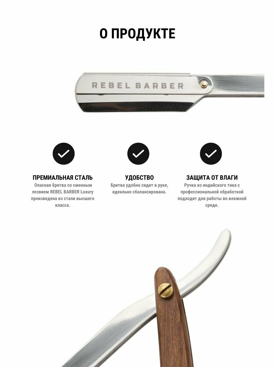 Rebel Barber Luxury Shavette - произведена из стали высшего класса, с ручкой из золотисто-коричневого индийского дерева Тик. Дерево сильно ценится в Европе и Азии. Деревянная ручка обработана и защищена от влаги и вредителей.Бритва удобно сидит в руке, сбалансирована. Способ применения: перед бритьем необходимо распарить кожу теплой водой. Это расширит поры, поспособствует мягкому удалению волос и лучшему результату. Для этого можно умыть лицо или приложить влажное теплое полотенце. Нанесите на кожу пену или крем для бритья. Возьмите в руки инструмент и, выбрав угол наклона в 30 градусов, начинайте аккуратно вести по лицу.