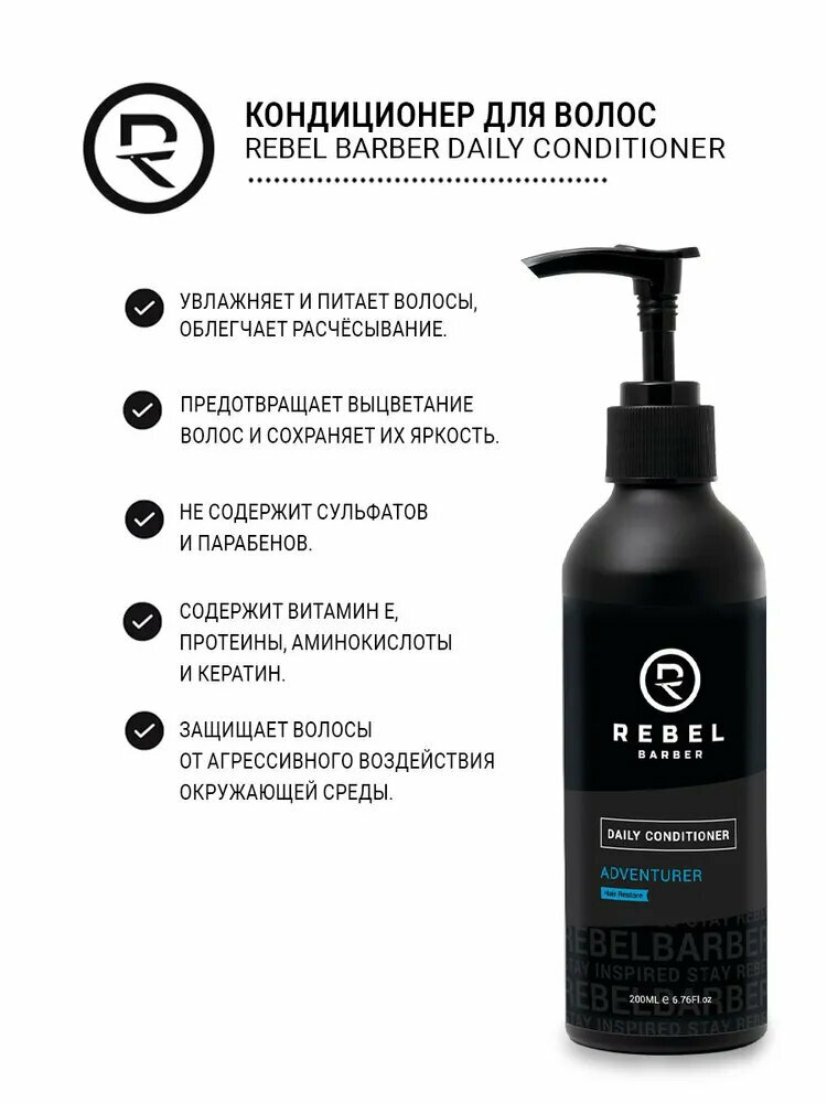 Восстанавливающий кондиционер от REBEL BARBER. Роскошное средство, которое укрепляет, увлажняет и защищает волосы без утяжеления. Благодаря уникальной смеси ингредиентов ухаживает за волосами, возвращает им жизненный блеск и придает аккуратный внешний вид. Обогащен витамином E, протеинами и кератином. Помогает сохранить цвет, слегка разглаживает волосы, делает их более густыми и добавляет толщину волоса, заполняя его. Поможет справиться с повреждениями , которые могут быть вызваны сушкой феном или укладкой. Подходит для всех типов волос. Подходит для ежедневного применения. Фирменный аромат Rebel Barber Adventurer с головокружительными и энергичными верхними нотами бергамота и лайма в сочетании с интригующими нотами сердца пачули, слышимыми на фоне базовых нот мускуса и амбры. Удобный дозатор поможет экономно расходовать средство.