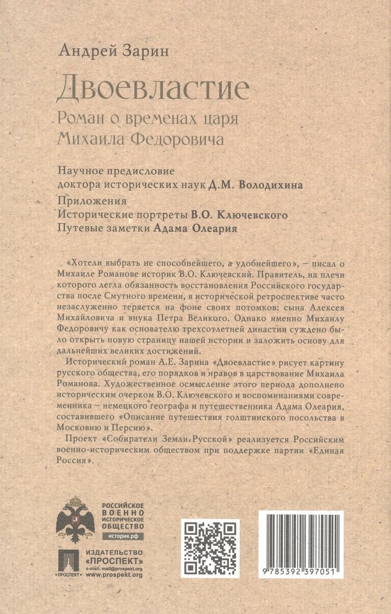 Исторический роман А.Е. Зарина «Двоевластие» рисует картину русского общества, его порядков и нравов в царствование Михаила Романова. Художественное осмысление этого периода дополнено историческим очерком В.О. Ключевского и воспоминаниями современника – немецкого географа и путешественника Адама Олеария, составившего «Описание путешествия голштинского посольства в Московию и Персию».