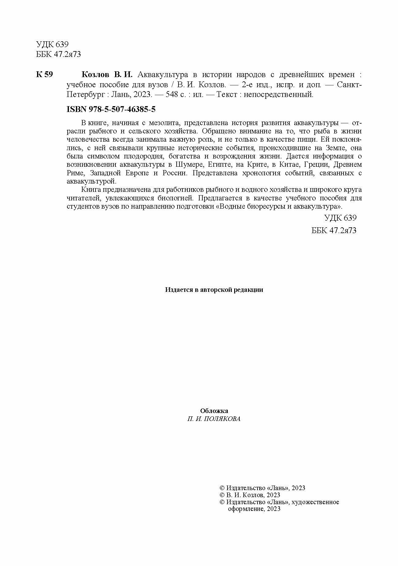 Аквакультура в истории народов с древнейших времен. Учебное пособие (В. И. Козлов); Издательство ЛАНЬ, 2023