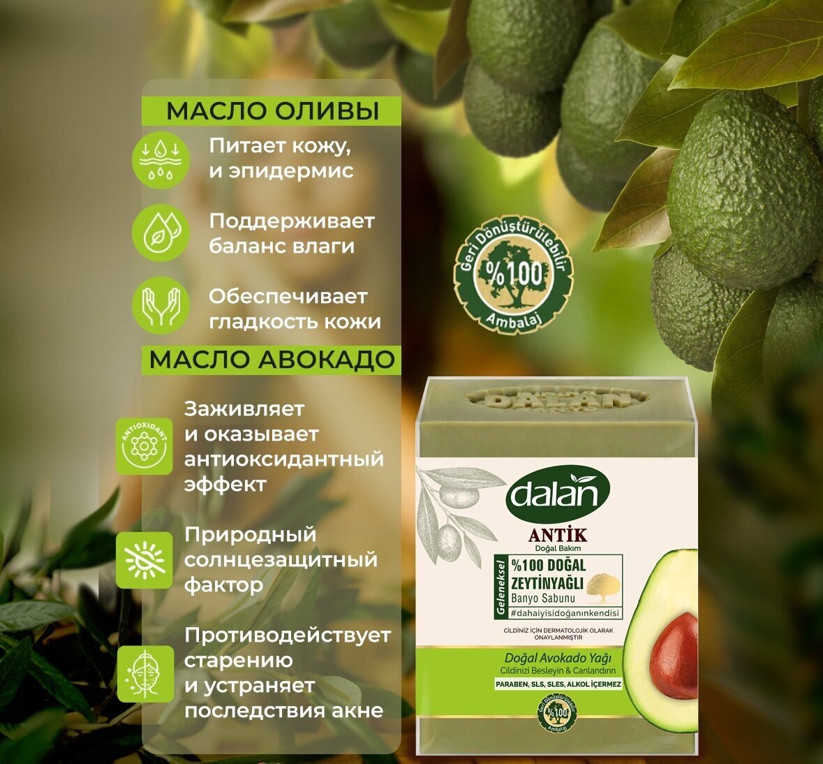 Турецкий бренд DALAN представляет натуральное мыло для бани в лучшем традиционном исполнении серии ANTIK в новинках - мыло кусковое с Аргановым маслом и маслом Авокадо. Банное мыло dalan содержит оливковое масло, плоды собирают с плантаций, расположенных в регионе Эгейского моря. Мыло ручной работы с Маслом авокадо по составу очень близкое к маслам, содержащимся в человеческой коже, хорошо впитывается, не образуя жирной пленки. Питательные вещества в составе органического мыла стимулируют производство коллагена в организме, который действует как барьер против обезвоживания и старения клеток организма. Богато протеинами, насыщенными и моно ненасыщенными жирными кислотами, витаминами A, D, E, B, магнием, медью, железом и фолиевой кислотой, масло авокадо является одним из самых эффективных масел в косметике. Легко и глубоко проникает в кожу и действует чудотворно на весь организм. Кроме того, масло авокадо обладает регенерирующими и антиоксидантными свойствами, которые помогают коже быстро заживать и успокаиваться. Данное твердое мыло подходит как для женщин, так и для мужчин. Оно бережно очищает кожу, обеспечивая ей мягкий уход и питание. Мыло туалетное идеально подходит для использования в бане, так как оно способствует обогащению кислородом тканей кожи и улучшает кровообращение. Банное мыло с маслом авокадо - это отличное натуральное мыло, которое подходит как для рук, так и для тела. Все мыла серии ANTIK изготовлены вручную в Турции из натуральных компонентов. Мыло кусковое твердое не сушит кожу и подходит для сухой, нормальной, жирной и комбинированной кожи. Твердое мыло в куске станет альтернативой жидкому туалетному мылу и гелю для душа. Если вы хотите подарить своим близким или друзьям что-то особенное, органическое мыло с маслом авокадо будет отличным выбором. Мыло для бани твердое обладает рядом полезных свойств, которые помогают бороться с сухостью, кожным раздражением и морщинами. Более того, это натуральное и органическое мыло для тела кусковое не только ухаживает за кожей, но и приятно пахнет, напоминая о тропических фруктах и летнем отдыхе.