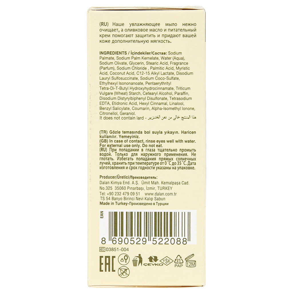 Эффективная формула твердого мыла с увлажняющим кремом от надежной турецкой компании DALAN на основе масла оливы и увлажняющего крема. Главная особенность крем мыла - это качественный состав, в котором присутствуют только натуральные компоненты. Главным действующим веществом мыла для рук и тела является масло оливы. Плоды собирают в Эгейском регионе. При систематическом использовании мыло для проблемной кожи можно добиться отличного увлажняющего и питательного эффекта. Оливковое мыло для рук - универсальное косметическое средство, которое подойдет для любого типа кожи: сухой, чувствительной, жирной и комбинированной. Допустимо использование для гигиенического ухода в бане и сауне, в душе. Благодаря привлекательной упаковке, подарочное мыло ручной работы станет отличным подарком для близких и друзей. При систематическом использовании крем мыла с маслом кожа становится увлажненной, мягкой и шелковистой. Кусковое мыло туалетное увлажняющее способствует деликатному очищению и защищает от воздействия негативных внешних факторов благодаря своему натуральному составу Dalan эко мыло для ванны можно использовать каждый день. Крем мыло для рук оказывает омолаживающее действие, восполняя недостаток влаги эпидермиса. Вся уходовая косметика для тела бренда протестирована дерматологами. Увлажняющее мыло косметическое твердое гипоаллергенное иде