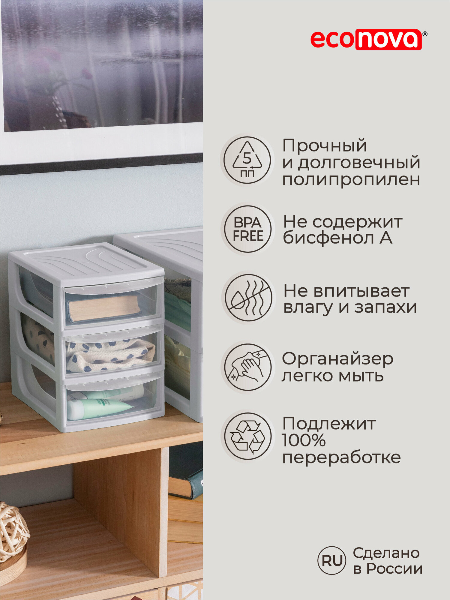 Органайзеры Econova станут удачным приобретением как для дома, так и для офиса. Органайзер формата А5 подойдет для организации бумаг на столе, игрушек, товаров для творчества и школы в детской, хозяйственных товаров в ванной, строительных материалов в гараже, швейных товаров и др. Легкий органайзер удобен в транспортировке. Несколько органайзеров надежно ставятся один на другой. Специальные стопоры не дадут ящикам выпасть, даже если их сильно выдвинуть. Прозрачные стенки позволяют видеть, что хранится внутри каждого из ящиков. Прочный органайзер сделан из безопасного высококачественного полипропилена.