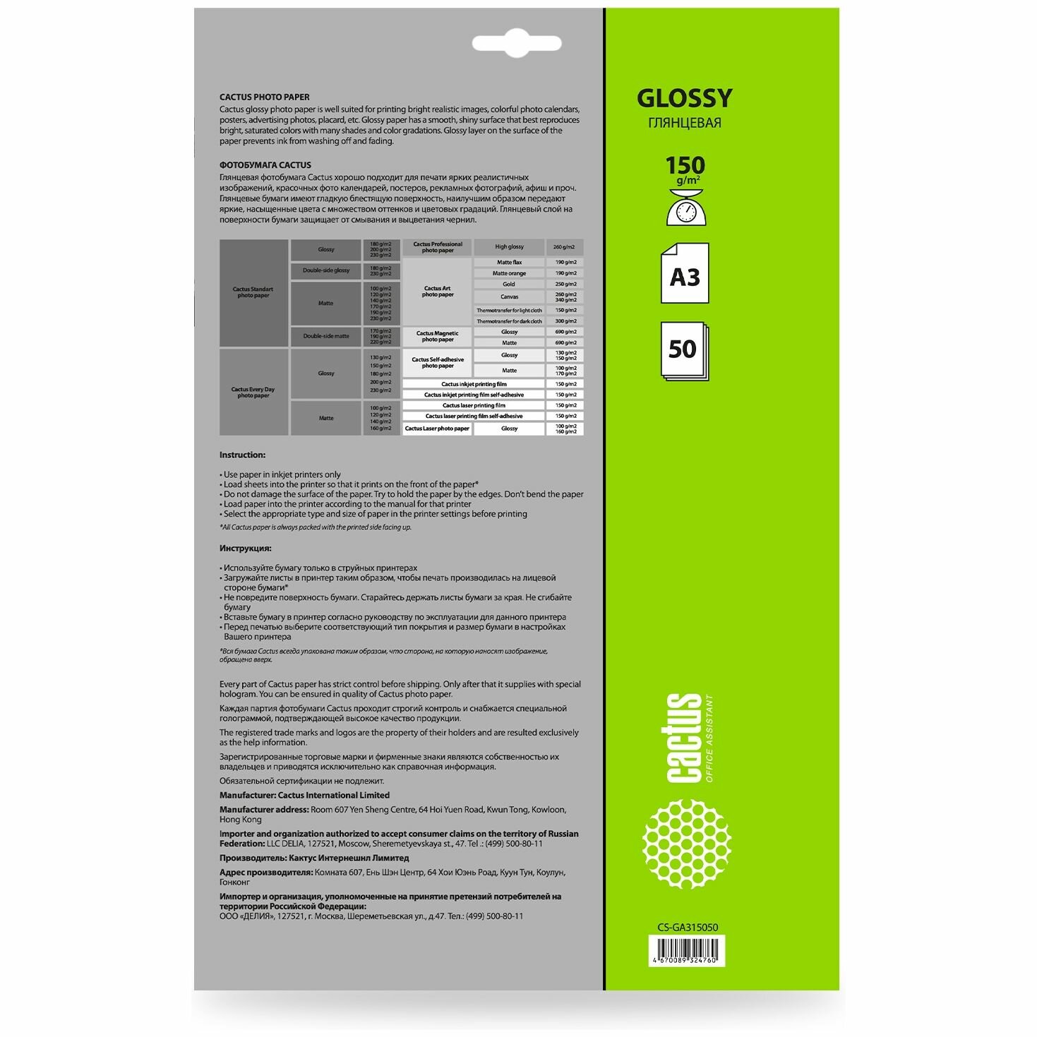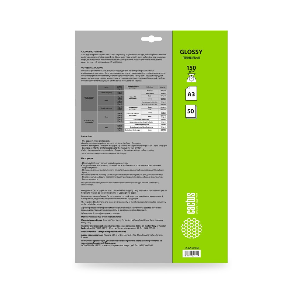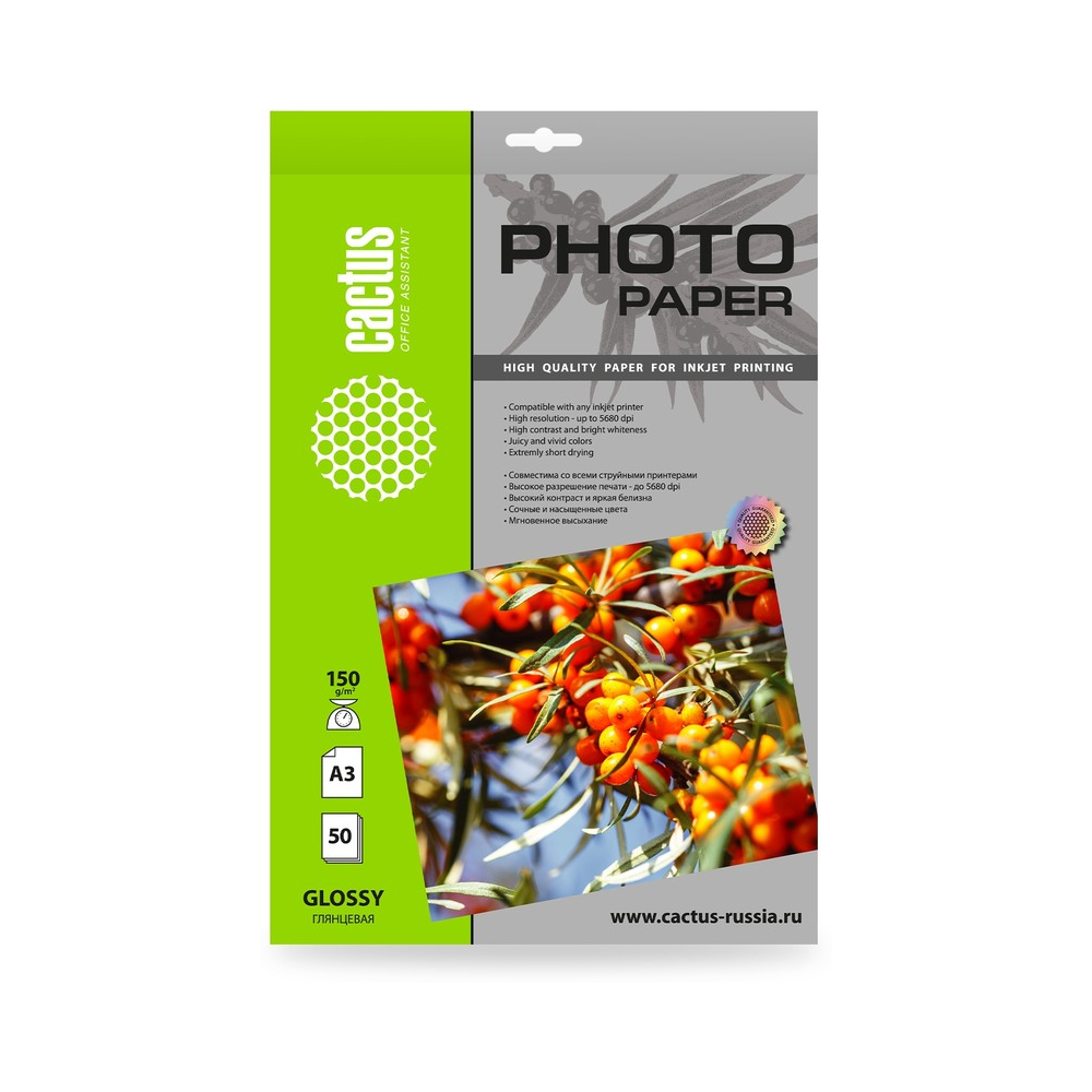 Фотобумага Cactus CS-GA315050 формат A3, плотность 150г/м2, 50 листов, покрытие глянцевое, для струйной печати, белый
