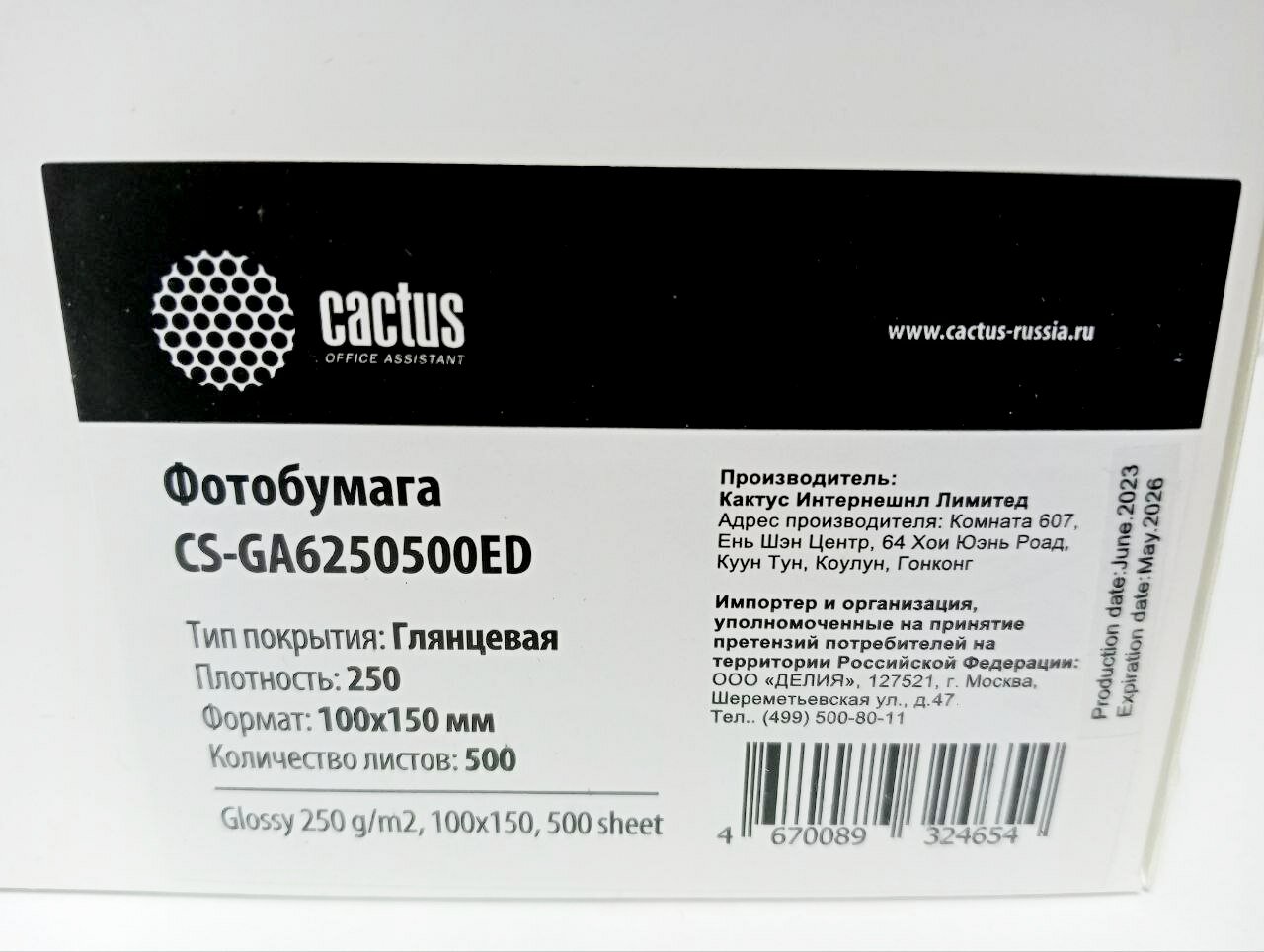 Фотобумага Cactus CS-GA6250500ED формат A6, плотность 250г/м2, 500 листов, покрытие глянцевое, для струйной печати, белый