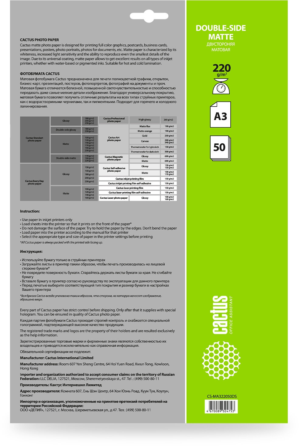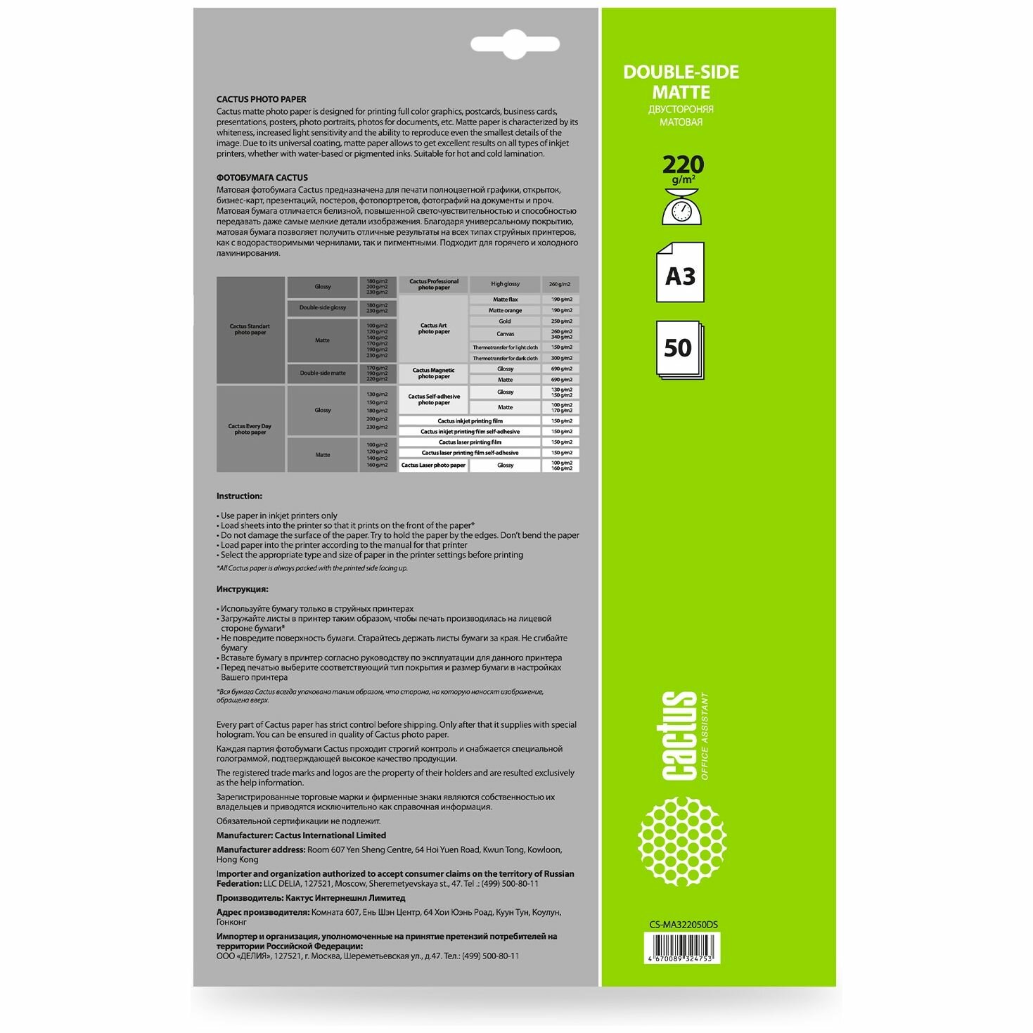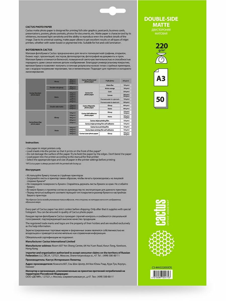 Фотобумага Cactus CS-MA322050DS формат A3, плотность 220г/м2, 50 листов, покрытие матовое/матовое, для струйной печати, белый