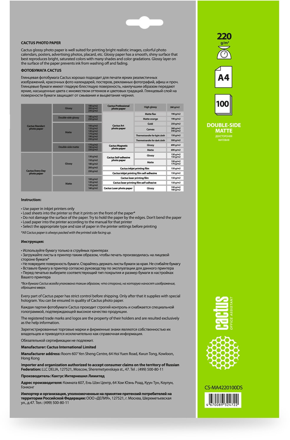 Фотобумага Cactus CS-MA4220100DS формат A4, плотность 220г/м2, 100 листов, двусторонняя, покрытие матовое/матовое, для струйной печати, белый