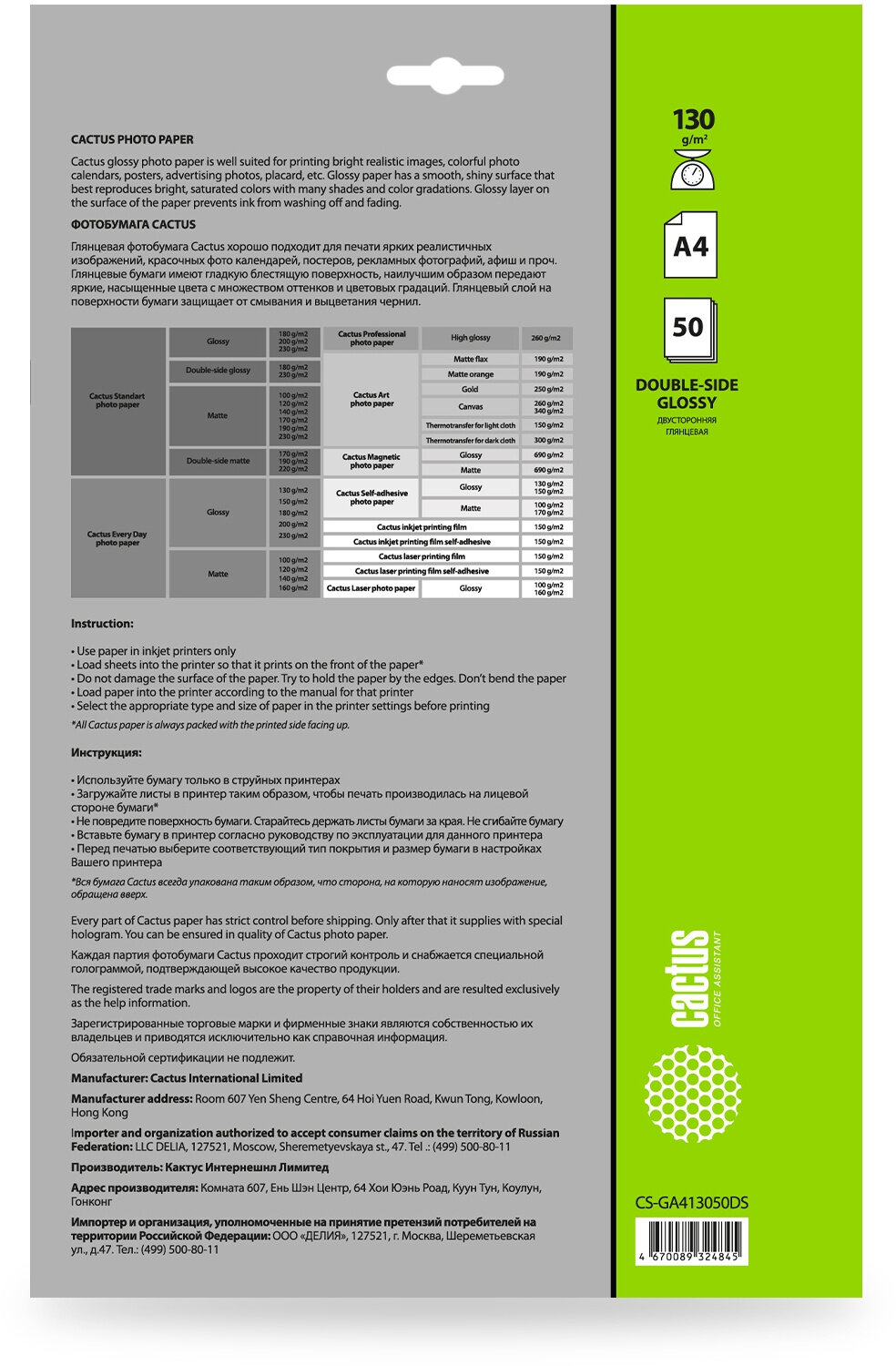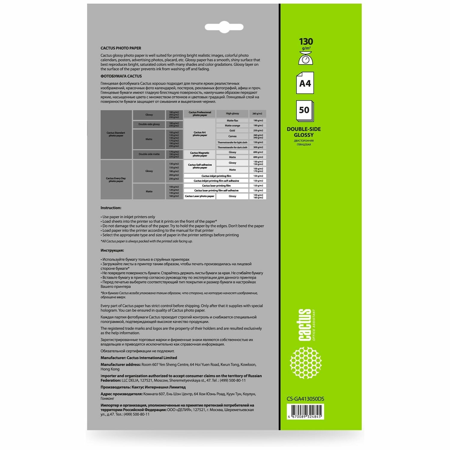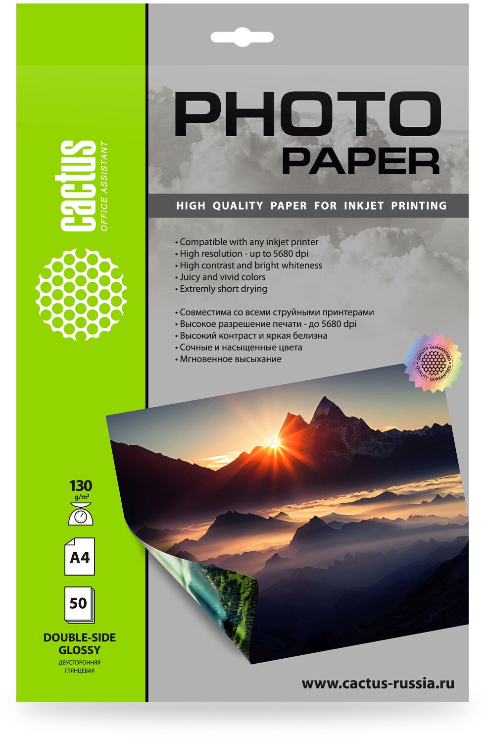 Фотобумага Cactus CS-GA413050DS формат A4, плотность 130г/м2, 50 листов, покрытие глянцевое/глянцевое, для струйной печати, белый