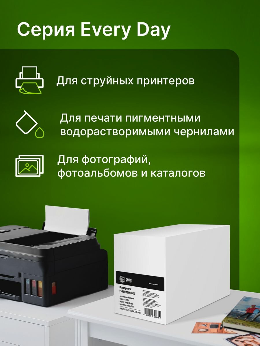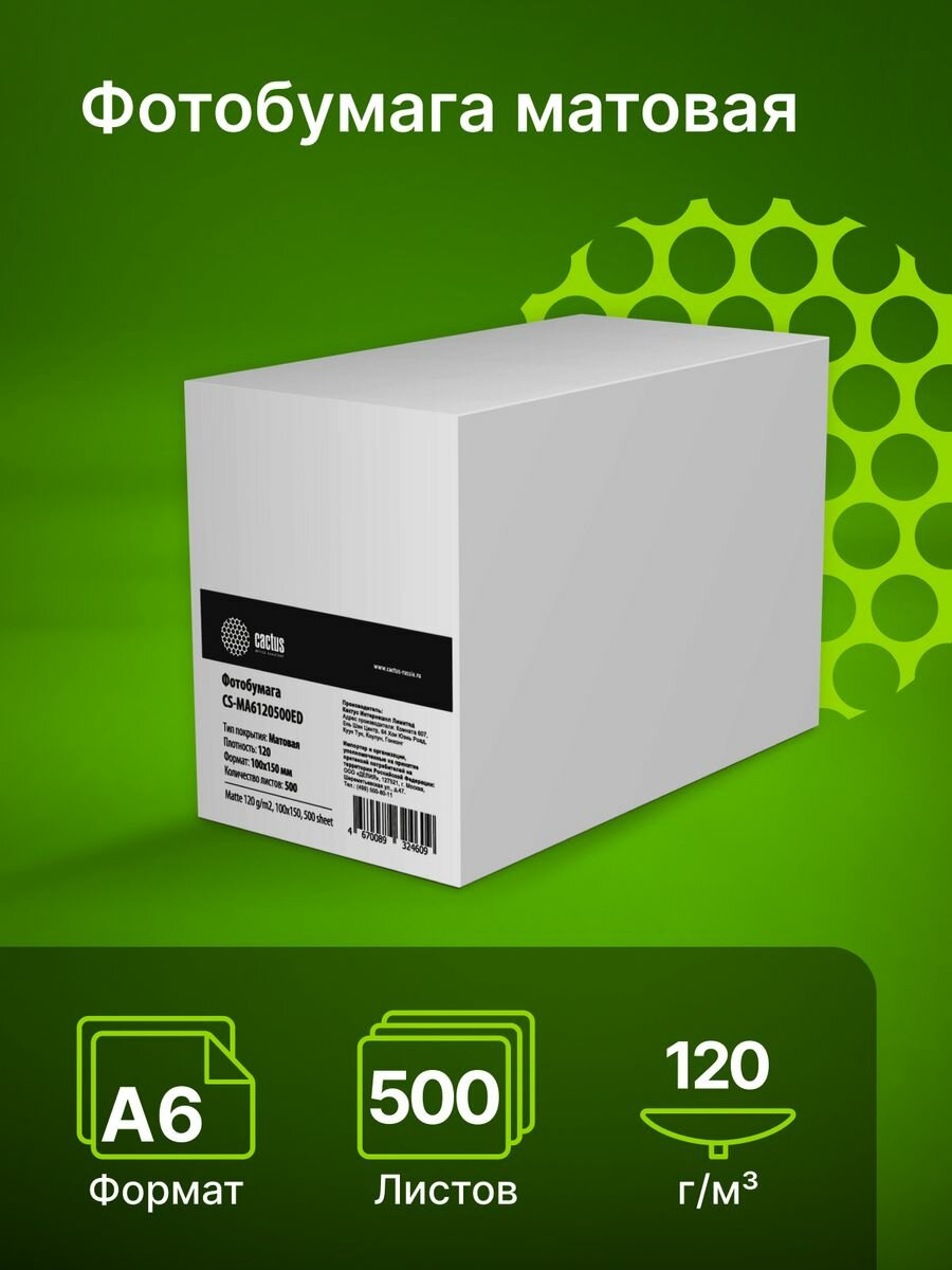 Фотобумага Cactus CS-MA6120500ED формат A6, плотность 120г/м2, 500 листов, покрытие матовое/матовое, для струйной печати, белый