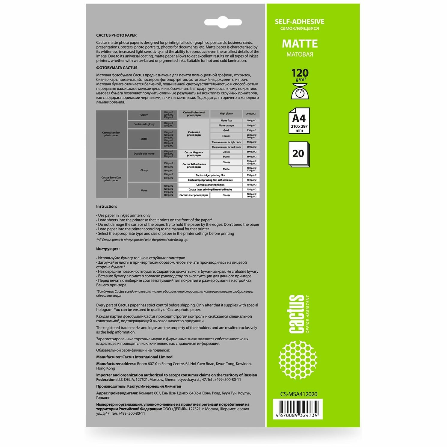 Фотобумага Cactus формат A4, плотность 120г/м2, 20 листов, покрытие матовое, с самоклеющимся слоем, для струйной печати, белый (CS-MSA412020)