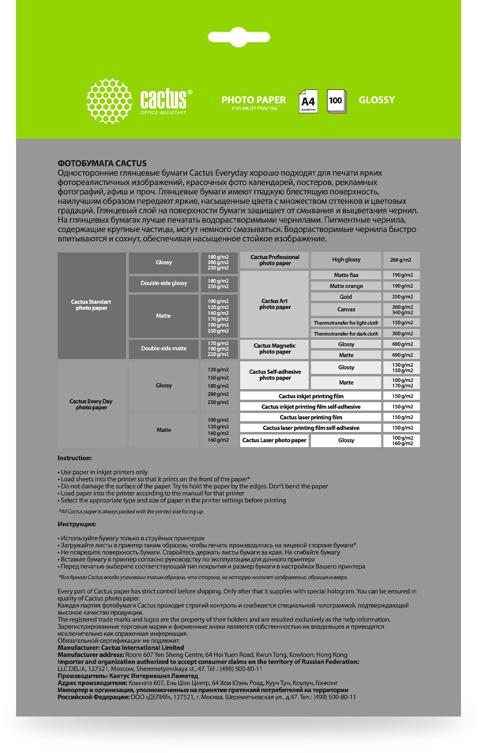 Фотобумага Cactus CS-GA4150100ED формат A4, плотность 150г/м2, 100 листов, покрытие глянцевое, для струйной печати, белый