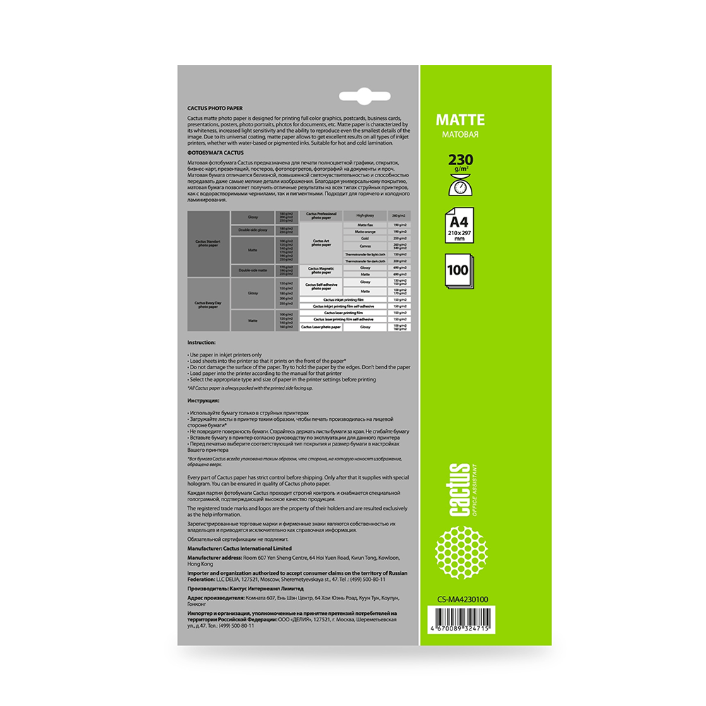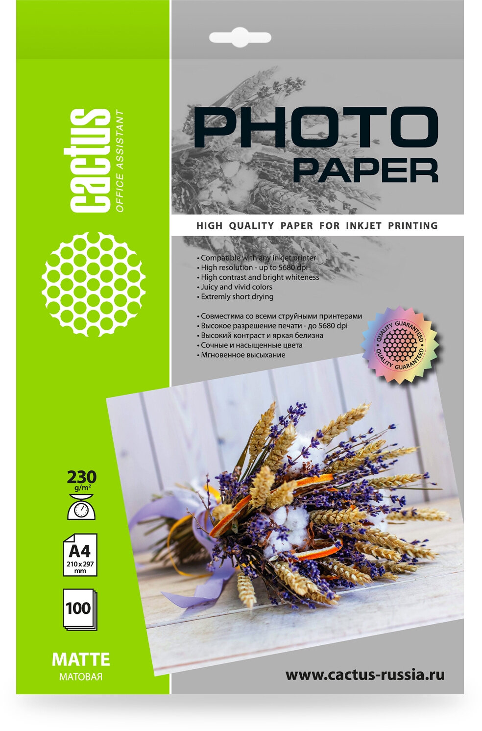 Фотобумага Cactus CS-MA4230100 формат A4, плотность 230г/м2, 100 листов, покрытие матовое, для струйной печати, белый