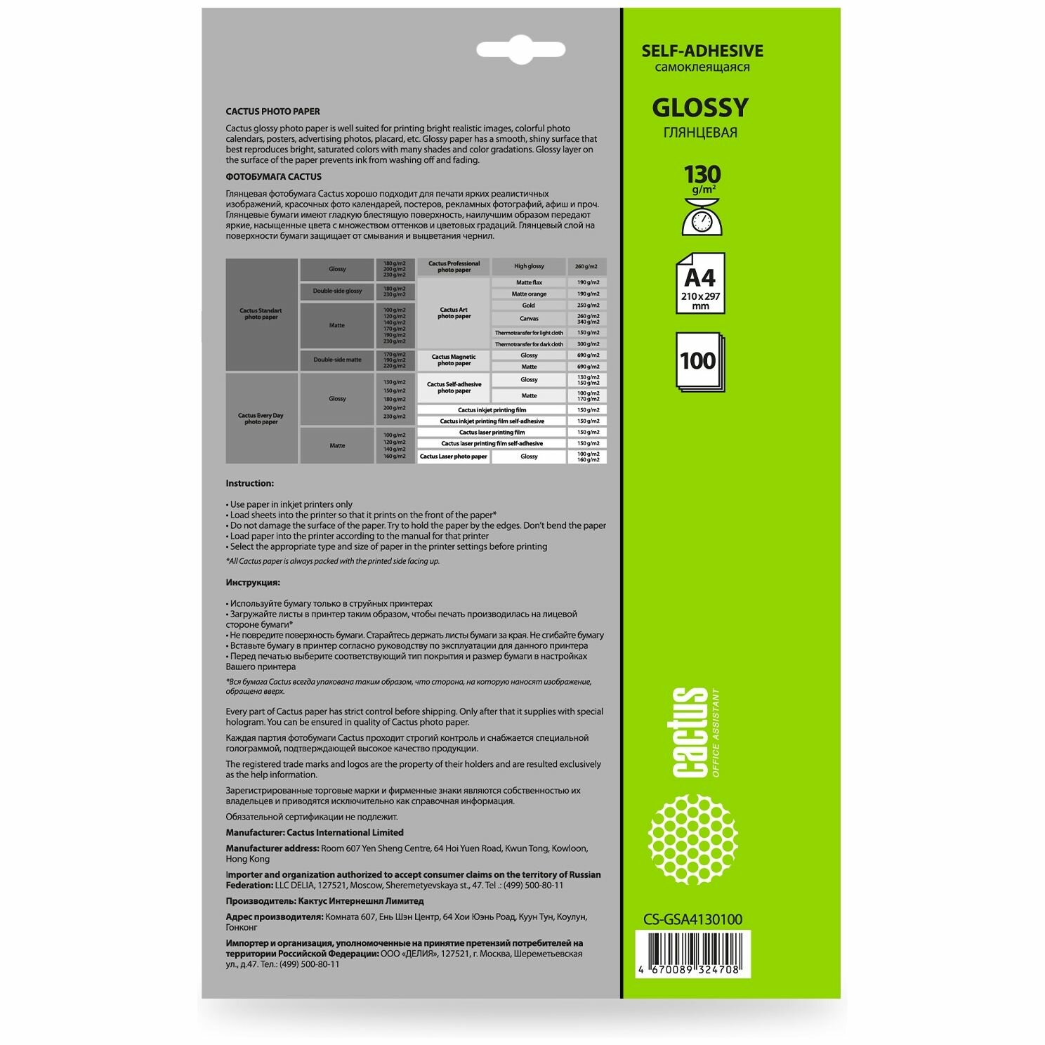 Фотобумага Cactus CS-GSA4130100 формат A4, плотность 130г/м2, 100 листов, покрытие глянцевое, с самоклеющимся слоем, для струйной печати