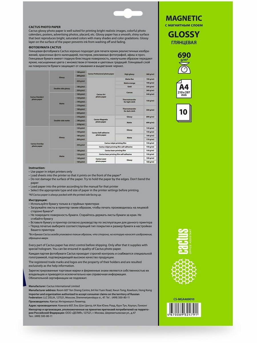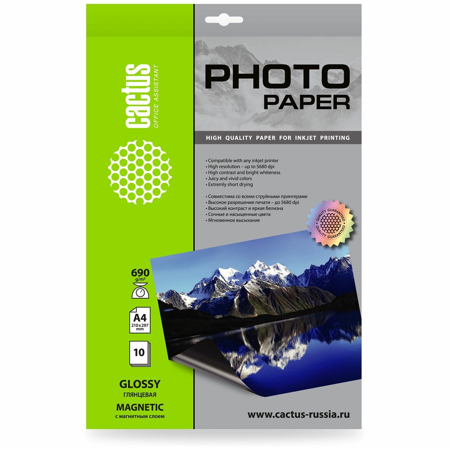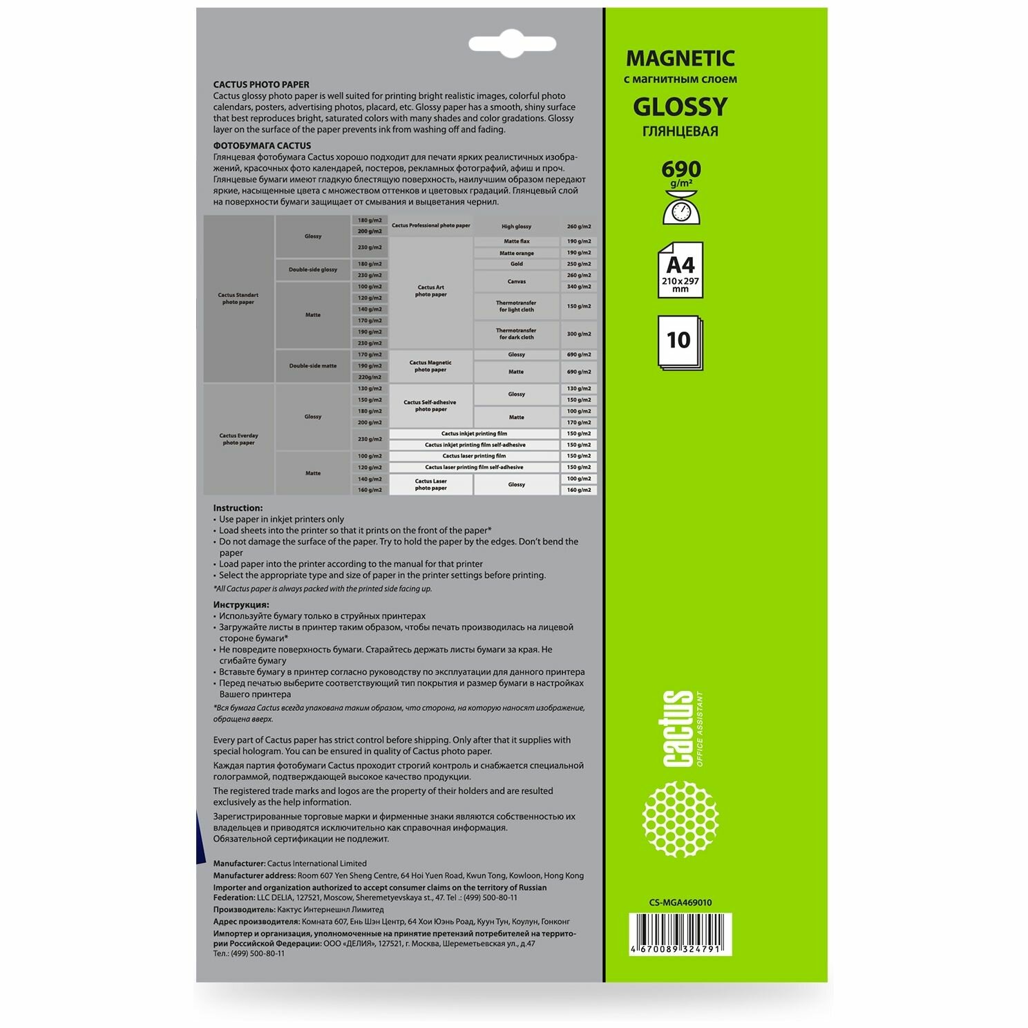 Фотобумага Cactus CS-MGA469010 формат A4, плотность 690г/м2, 10 листов, покрытие глянцевое/магнитный слой, для струйной печати, белый