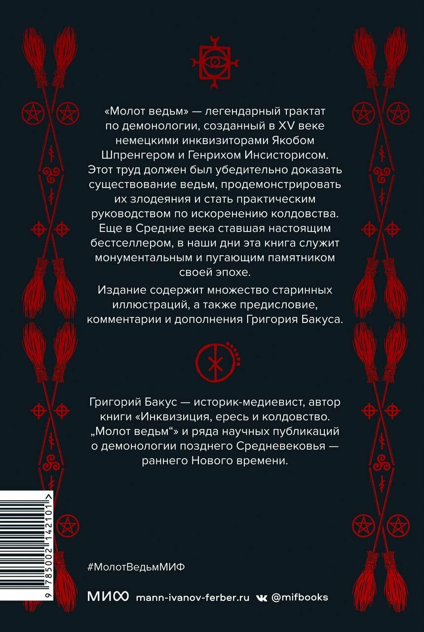"Молот ведьм" — легендарный трактат по демонологии, созданный в XV веке немецкими инквизиторами Якобом Шпренгером и Генрихом Инсисторисом. Этот труд должен был убедительно доказать существование ведьм, продемонстрировать их злодеяния и стать практическим руководством по искоренению колдовства. Еще в Средние века ставшая настоящим бестселлером, в наши дни эта книга служит монументальным и пугающим памятником своей эпохе. Издание содержит множество старинных иллюстраций, а также предисловие, комментарии и дополнения историка-медиевиста Григория Бакуса, ведущего специалиста по этому произведению.