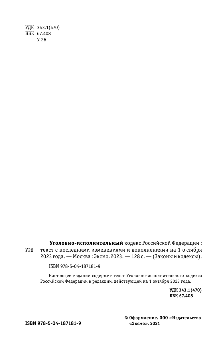 Уголовно-исполнительный кодекс Российской Федерации. Текст с последними изменениями и дополнениями на 1 октября 2023 года (Волнухина Д. (ред.)); ООО "Издательство "Эксмо", 2023