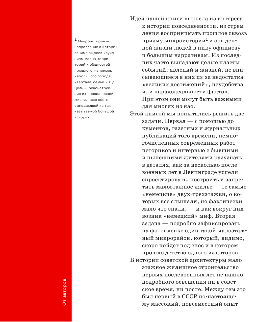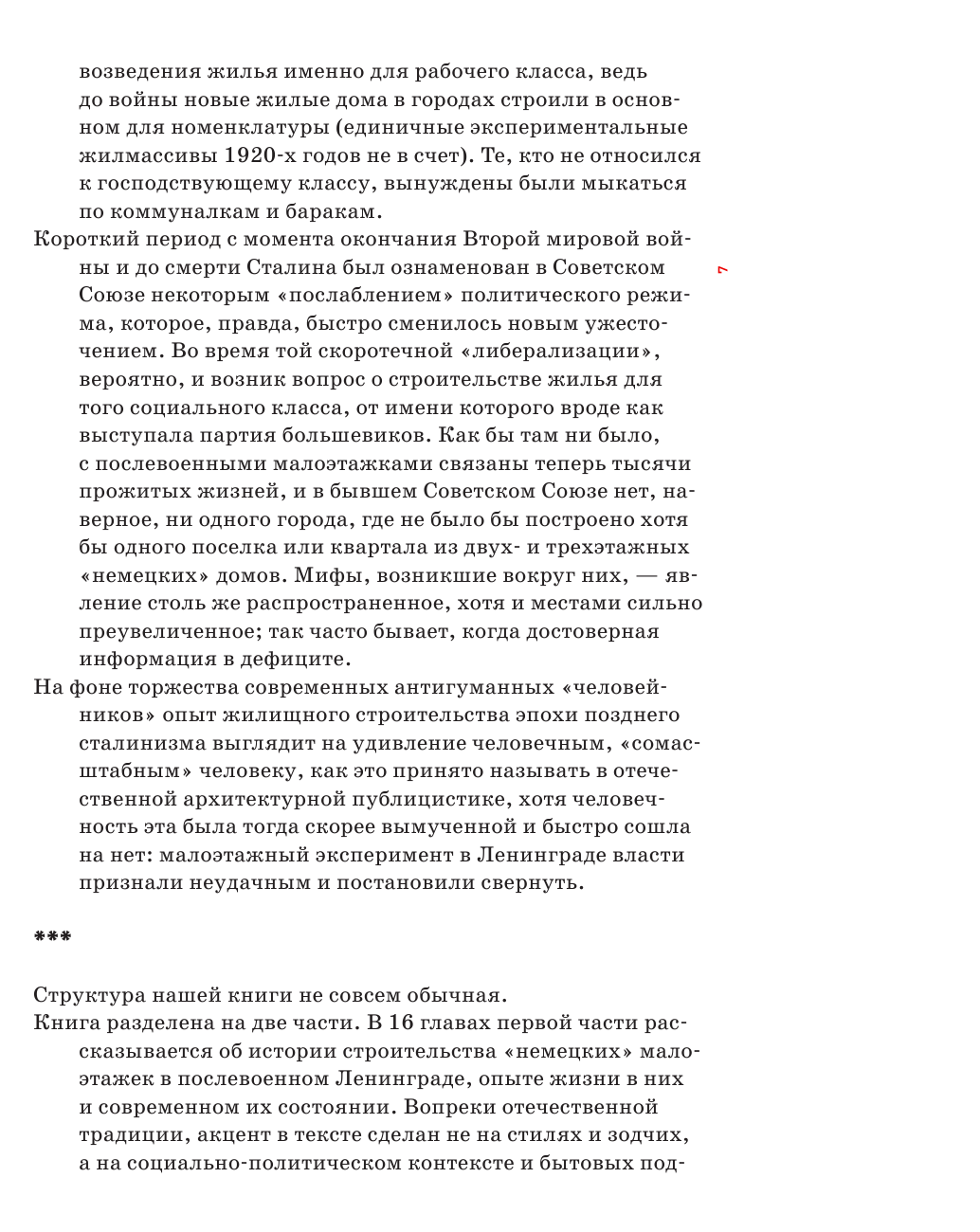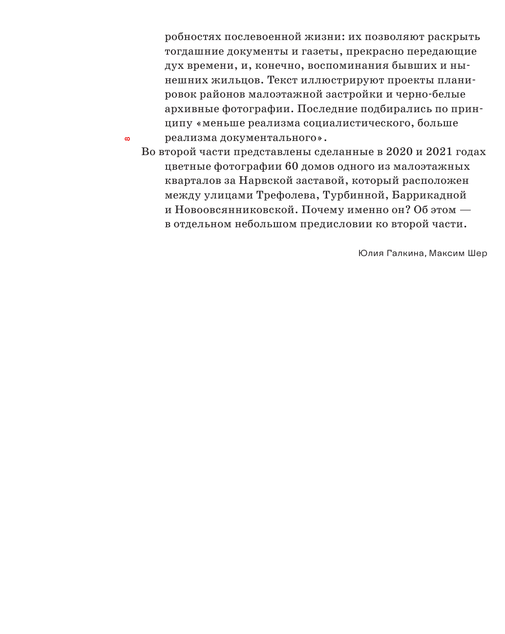 Книга "Двухэтажный Ленинград. Жилая застройка 1945–1950 годов" дополняет серию "Истории домов и их жителей". В издании впервые собраны материалы по истории малоэтажной жилой застройки и повседневной жизни Ленинграда первых послевоенных лет. Двух- и трехэтажные дома, построенные в то время, иногда называют "немецкими". Помимо уникальных архивных фотоснимков, а также чертежей 1940-х гг. в книгу включены сделанные недавно цветные фотографии всех построек в одном из малоэтажных кварталов за Нарвской заставой. Этот характерный пример архитектуры конца 1940-х оказался под угрозой сноса. Послевоенные рабочие районы редко становятся частью туристических маршрутов, но именно они, как представляется, хранят дух своего времени. Книга является увлекательным источником информации об одной из малоизученных страниц в истории Ленинграда и будет интересна как профессиональным исследователям, так и всем, кто любит Петербург.