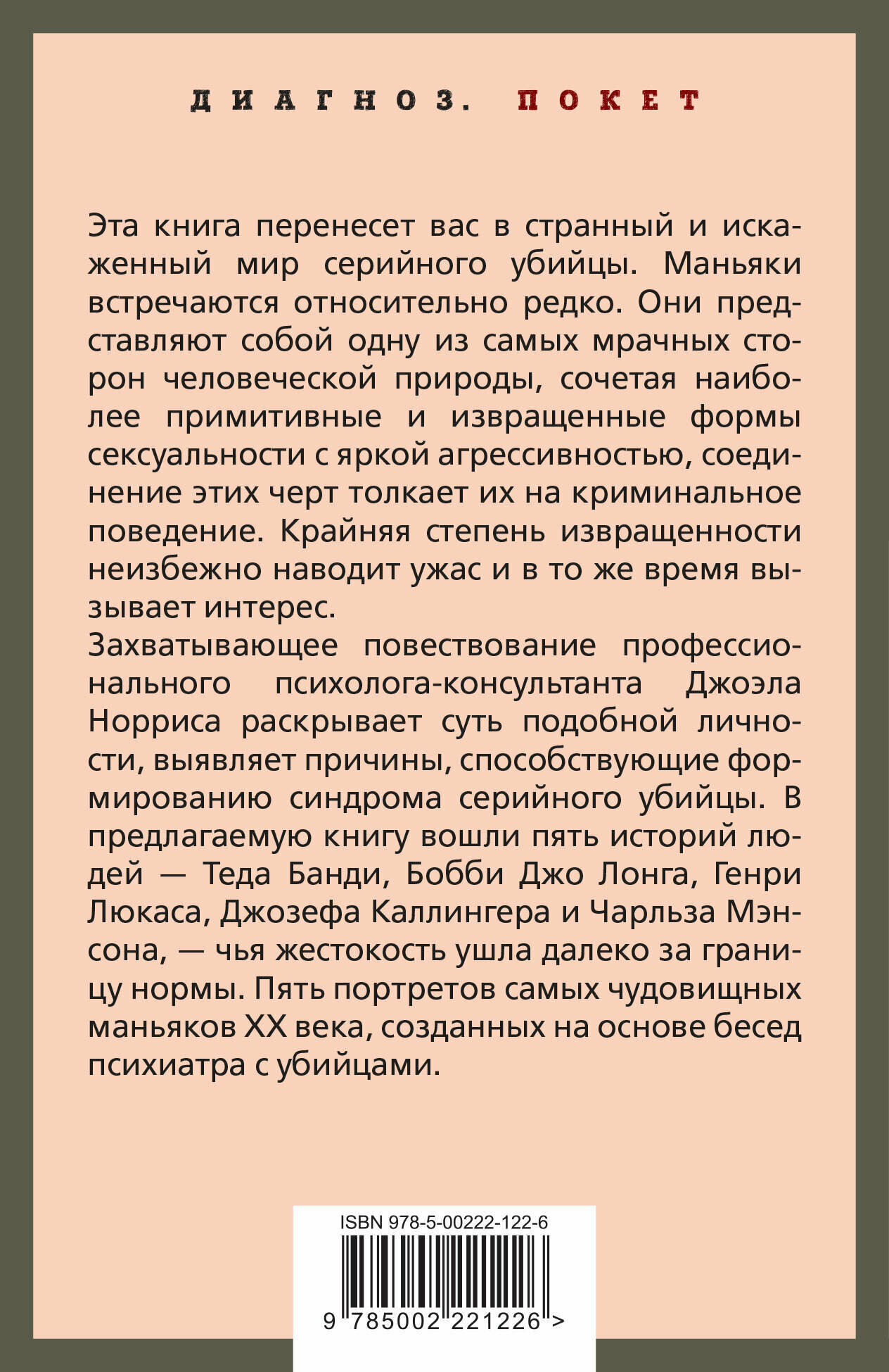 Эта книга перенесет вас в странный и искаженный мир серийного убийцы. Маньяки встречаются относительно редко. Они представляют собой одну из самых мрачных сторон человеческой природы, сочетая наиболее примитивные и извращенные формы сексуальности с яркой агрессивностью, соединение этих черт толкает их на криминальное поведение. Крайняя степень извращенности неизбежно наводит ужас и в то же время вызывает интерес. Захватывающее повествование Джоэла Норриса раскрывает суть подобной личности, выявляет причины, способствующие формированию синдрома серийного убийцы. В предлагаемую книгу вошли пять историй людей, чья жестокость ушла далеко за границу нормы. Пять портретов самых чудовищных маньяков ХХ века, созданных на основе бесед психиатра с убийцами.
