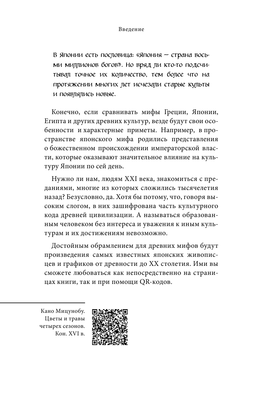 На страницах этой книги вы встретитесь со своенравными богами, грозными драконами, воинами Бэнкэем и Кинтаро, Снежной девой Юки-онна и Девой цветения, коварными лисами-кицунэ, призраками, оборотнями и чертями. Красочные описания и неожиданные повороты погрузят вас в самое сердце японской мифологии, раскрывая глубокое символическое значение и жизненные уроки, заключенные в каждой истории. Цветные и черно-белые иллюстрации, QR-коды, ведущие на страницы музеев и энциклопедий, дополнят путешествие в страну, где реальность переплетается с магией и легендами.