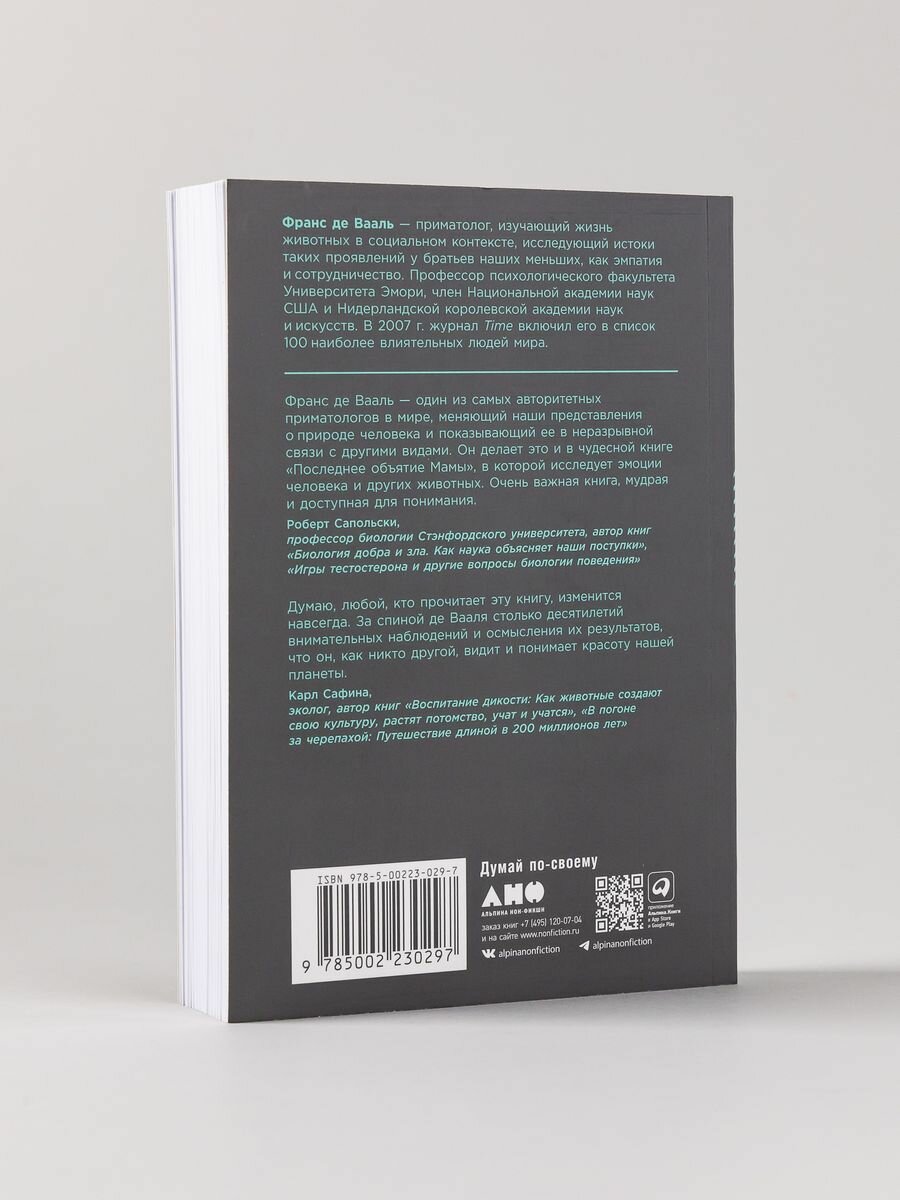 Испытывают ли животные гордость, стыд, вину или отвращение, как и мы, люди? Есть ли у них чувство справедливости и благодарности? Могут ли собаки смеяться и скорбеть, способны ли слоны утешать друг друга, а обезьяны завидовать, плести интриги и выстраивать планы мести? Чувствуют ли боль рыбы и умеют ли любить птицы? Что общего в поведении альфа-самцов шимпанзе и современных политиков? В этой доброй и умной книге, помимо трогательной истории шимпанзе по имени Мама, известный приматолог Франс де Вааль рассказывает о своих многочисленных наблюдениях и экспериментах, посвященных изучению эмоций самых разных животных. Наряду с гневом и ненавистью, приводящими даже к преднамеренному убийству себе подобных, животные обнаруживают удивительную способность к состраданию, примирению и прощению. Они, как и мы, способны к эмпатии, взаимопомощи и тесному социальному взаимодействию.