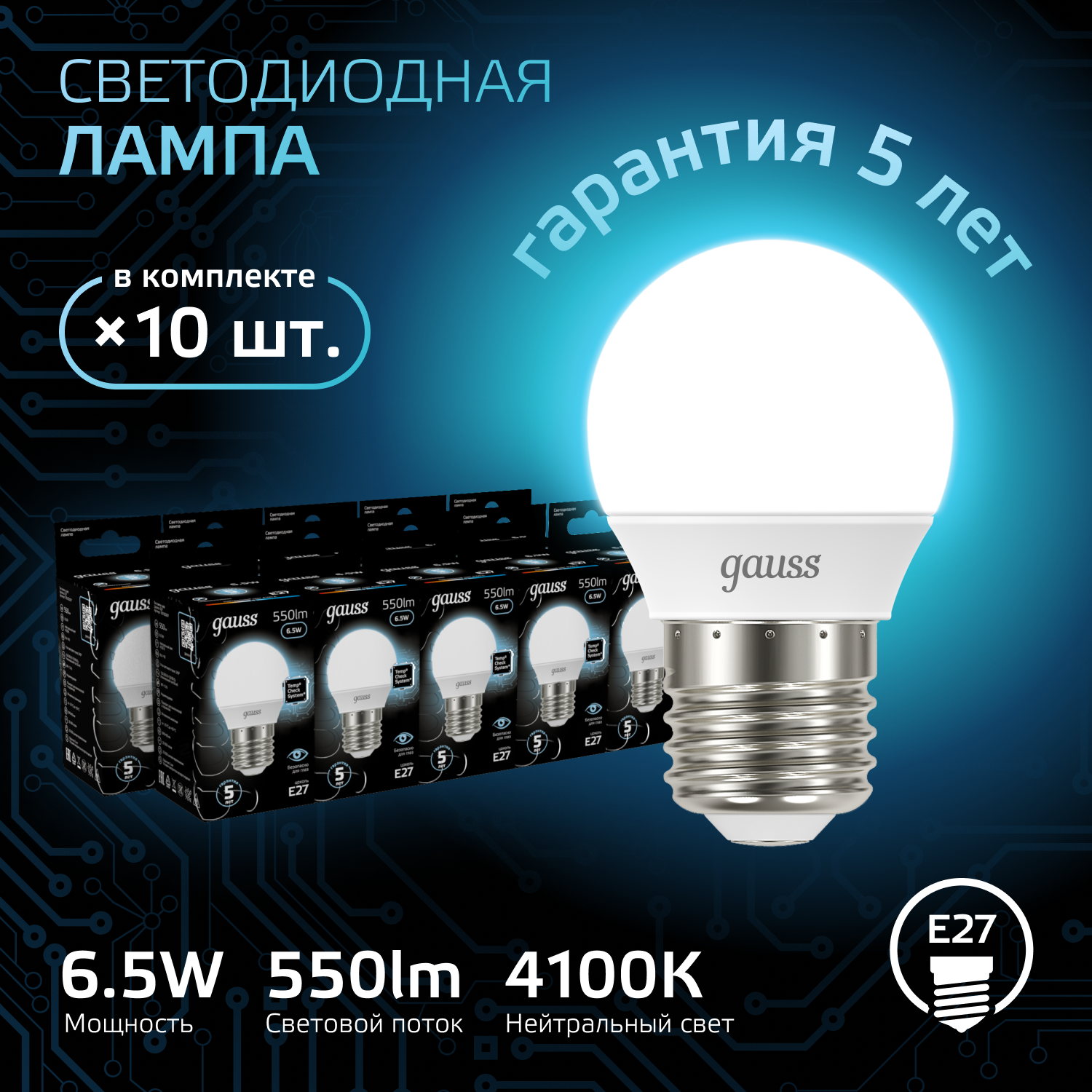 Лампа Gauss Шар 6.5W 550lm 4100K E27 LED 10шт Вартон
