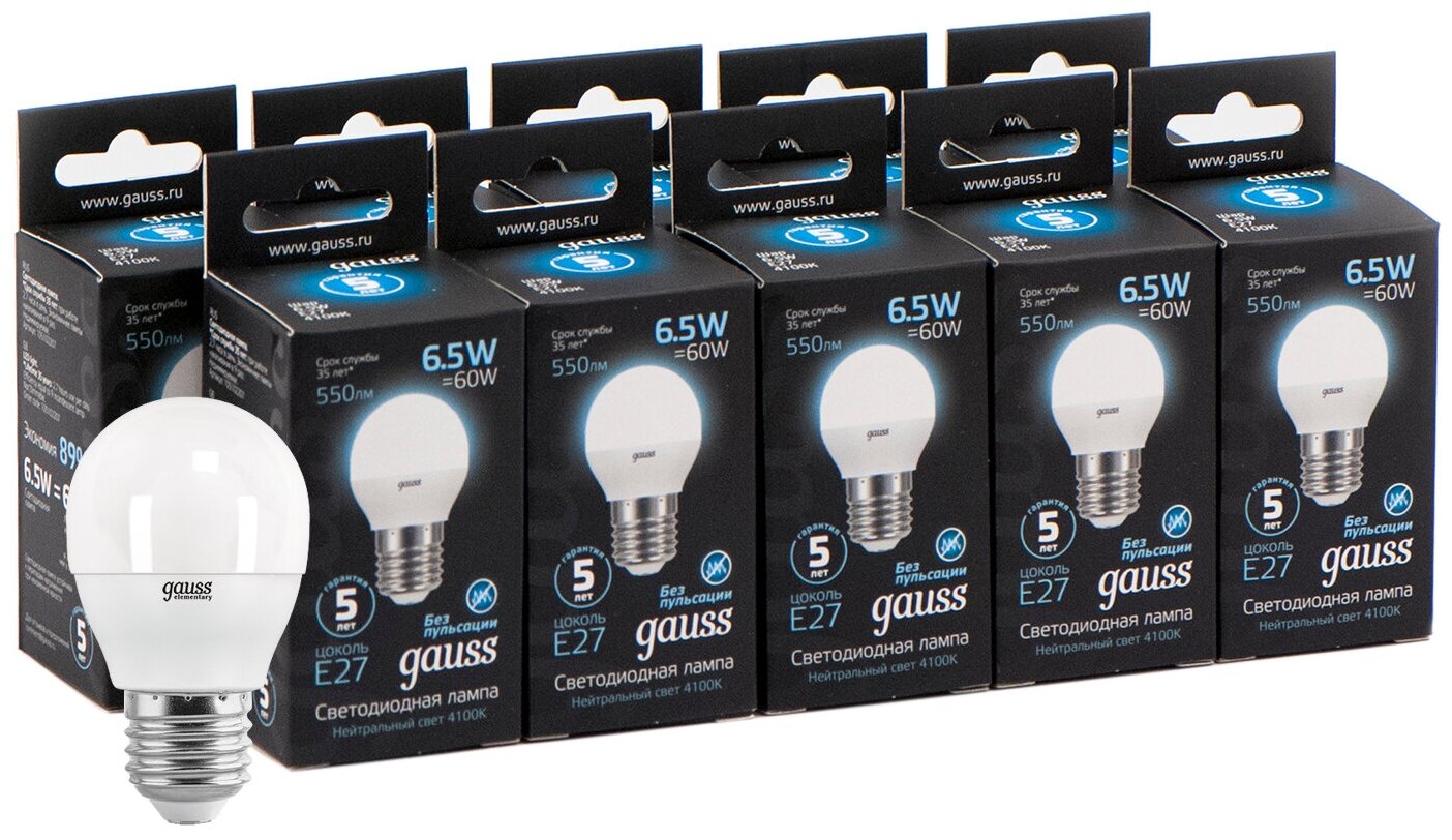 На сегодняшний день товар «Лампа Gauss Шар 6.5W 550lm 4100K E27 LED 10шт Вартон» можно купить с кешбеком в 1 магазине: Яндекс.Маркет